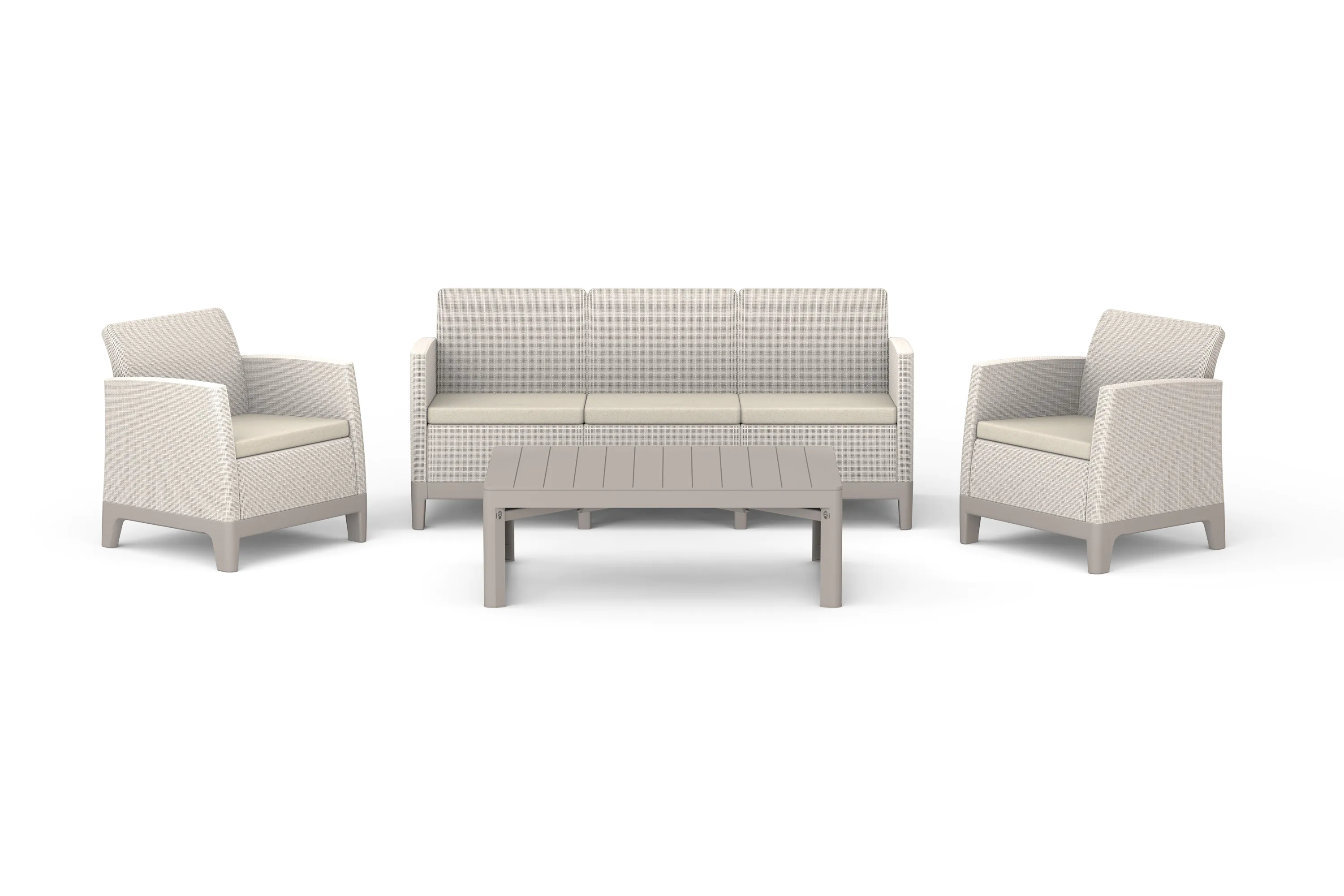 Komplet ogrodowy SCANDI MAX3/LYON Ash Grey-Storm Grey / St. Grey marki Keter to prestiżowa propozycja dla miłośników outdoorowego designu. Wyrafinowane zestawienie 3-osobowej sofy, dwóch foteli i inteligentnego stołu Lyon tworzy ekskluzywną strefę relaksu. Unikalna tekstura inspirowana naturalną jutą w fotelu i sofie oraz szlachetna paleta szarości nadają tarasowi nowoczesny, skandynawski charakter. Dzięki zaawansowanym materiałom odpornym na UV i zmienną aurę, zestaw zachowuje nieskazitelną formę przez lata, oferując bezkompromisowy komfort i luksusowy sznyt w Twoim ogrodzie.