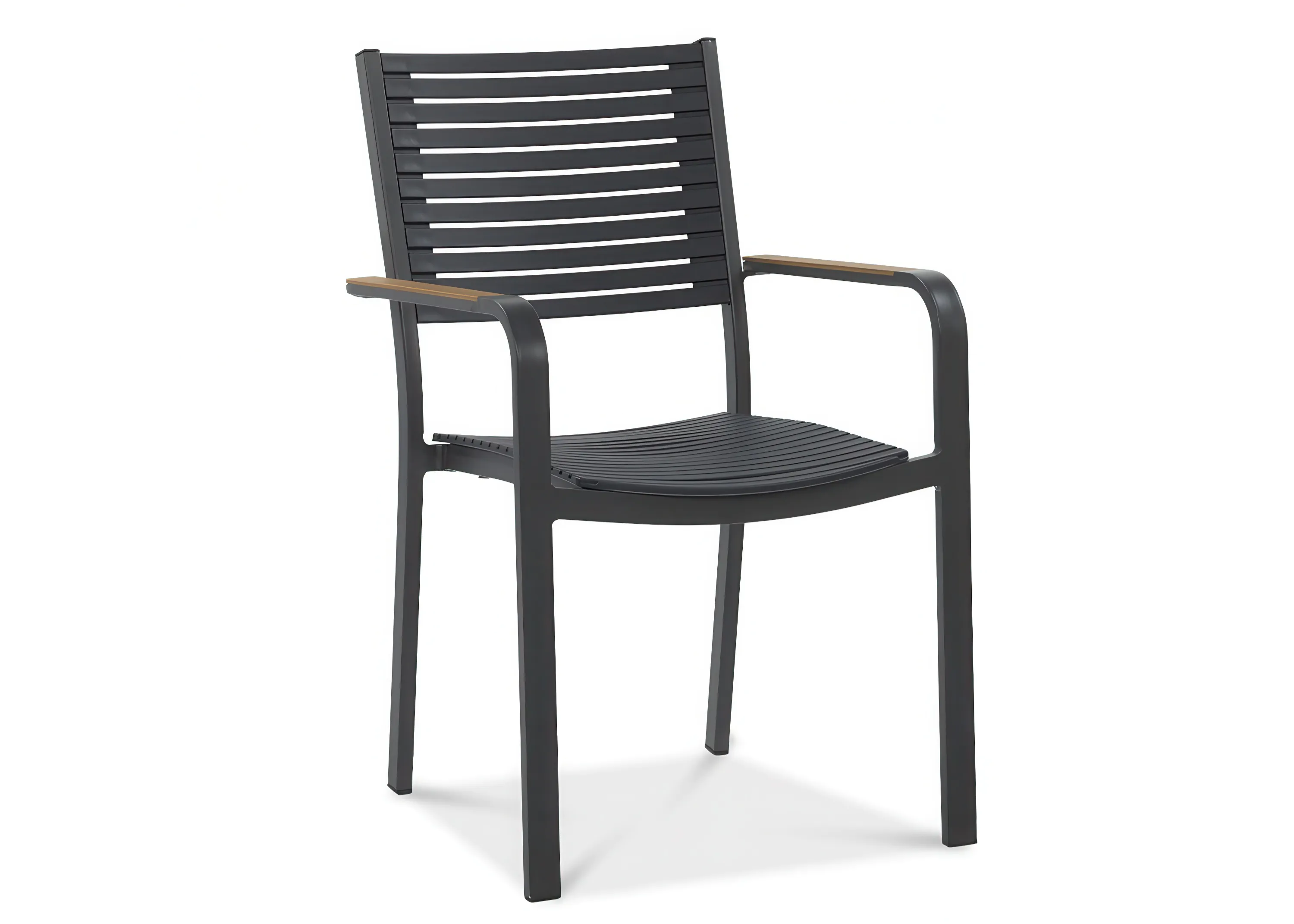 Odkryj ponadczasowe piękno w nowoczesnej odsłonie – wybierz krzesło Tacoma w eleganckim kolorze grafitowym. Wzbogać swój ogrodowy kącik jadalniany w praktyczne elementy wyposażenia, które zapewnią Ci maksymalny komfort wypoczynku. Tacoma to propozycja dla osób, które chcą spędzać czas z bliskimi na świeżym powietrzu w stylowym i przytulnym otoczeniu. Krzesło ogrodowe Tacoma – trwałość, funkcjonalność, styl Krzesło ogrodowe Tacoma składa się z lekkiej, a jednocześnie trwałej ramy aluminiowej malowanej proszkowo na kolor grafitowy. Siedzisko i oparcie wykonane są natomiast z trwałego plastiku wysokiej klasy. W oparciu zastosowano podłużne przerwy, które nie tylko podnoszą atrakcyjność mebla, lecz także umożliwiają swobodne odpływanie wody. Krzesło Tacoma to mebel zewnętrzny odporny na działanie niekorzystnych czynników atmosferycznych – deszczu, gradu, porywistego wiatru czy intensywnego promieniowania słonecznego. Jego ogromną zaletą jest także łatwość czyszczenia – wystarczy woda, ściereczka i odrobina detergentu. Zwróć uwagę również na podłokietniki wykończone polywoodem w kolorze teak. Ten drewnopodobny akcent dodaje konstrukcji stylowego, gustownego wyrazu. Grafitowe krzesło Tacoma – zadbaj o komfort wypoczynku w ogrodzie Uwielbiasz spędzać czas z bliski podczas wspólnego celebrowania posiłków w ogrodzie? Zadbaj o komfort siedzenia z krzesłami Tacoma! To meble o starannie dopracowanych proporcjach, dzięki którym nawet po wielu godzinach użytkowania nie zaznasz dyskomfortu. Wybierz krzesło Tacoma w kolorze grafitowym z dodatkami drewnopodobnymi i dodaj swojej przestrzeni eleganckiego wyrazu! Krzesła Tacoma nie skrzypią, nie chwieją się – to niezwykle stabilne i solidne produkty, które sprawdzą się świetnie przez naprawdę wiele sezonów, dodatkową są sztaplowane (wkładane jedno w drugie). W Focus Garden znajdziesz także praktyczne i stylowe stoły jadalnie do ogrodu i gotowe zestawy jadalniane do przydomowej strefy relaksu. Sprawdź je wszystkie i zaaranżuj przestrzeń skrojoną na miarę Twoich potrzeb!Cechy produktu