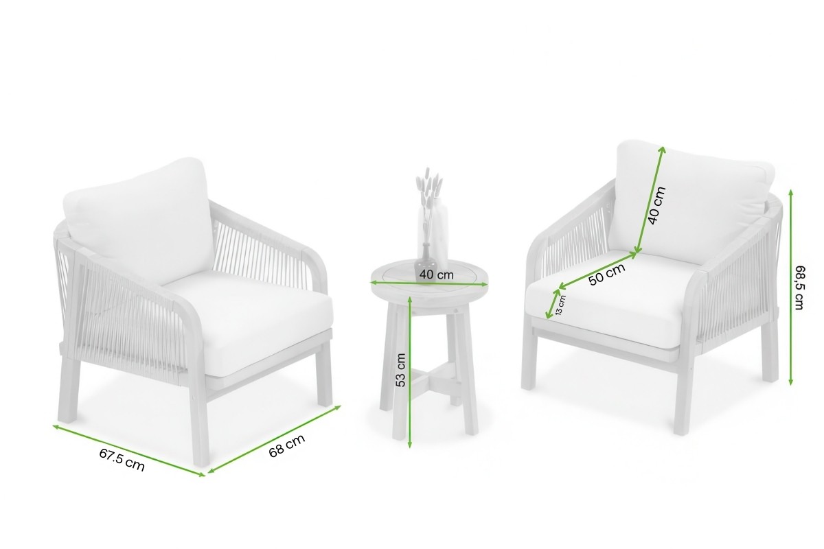 Konstrukcja mebla oparta jest na litej ramie z drewna akacjowego, które zapewnia wysoką stabilność i odporność na warunki zewnętrzne. Starannie dopasowane elementy, wzmocnione łączenia i przemyślana forma sprawiają, że całość jest trwała i solidna. Oparcia wykonano z estetycznej plecionki z wytrzymałego sznurka nylonowego, która zapewnia komfort użytkowania i wizualną lekkość.