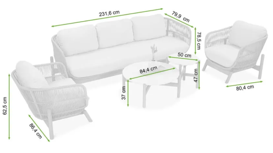 Zestaw składa się z: sofa, 2x stoły, 2x krzesła, poduszki