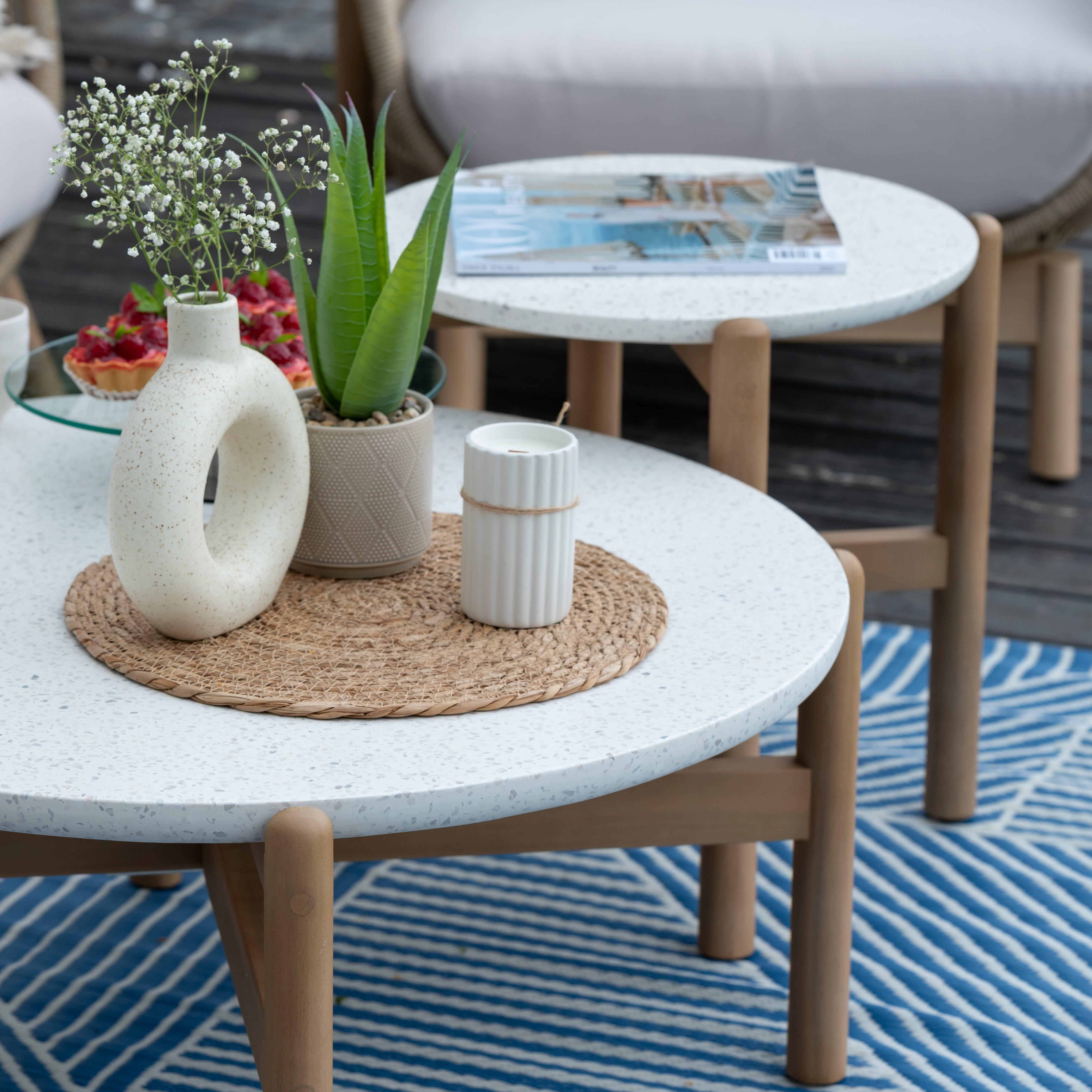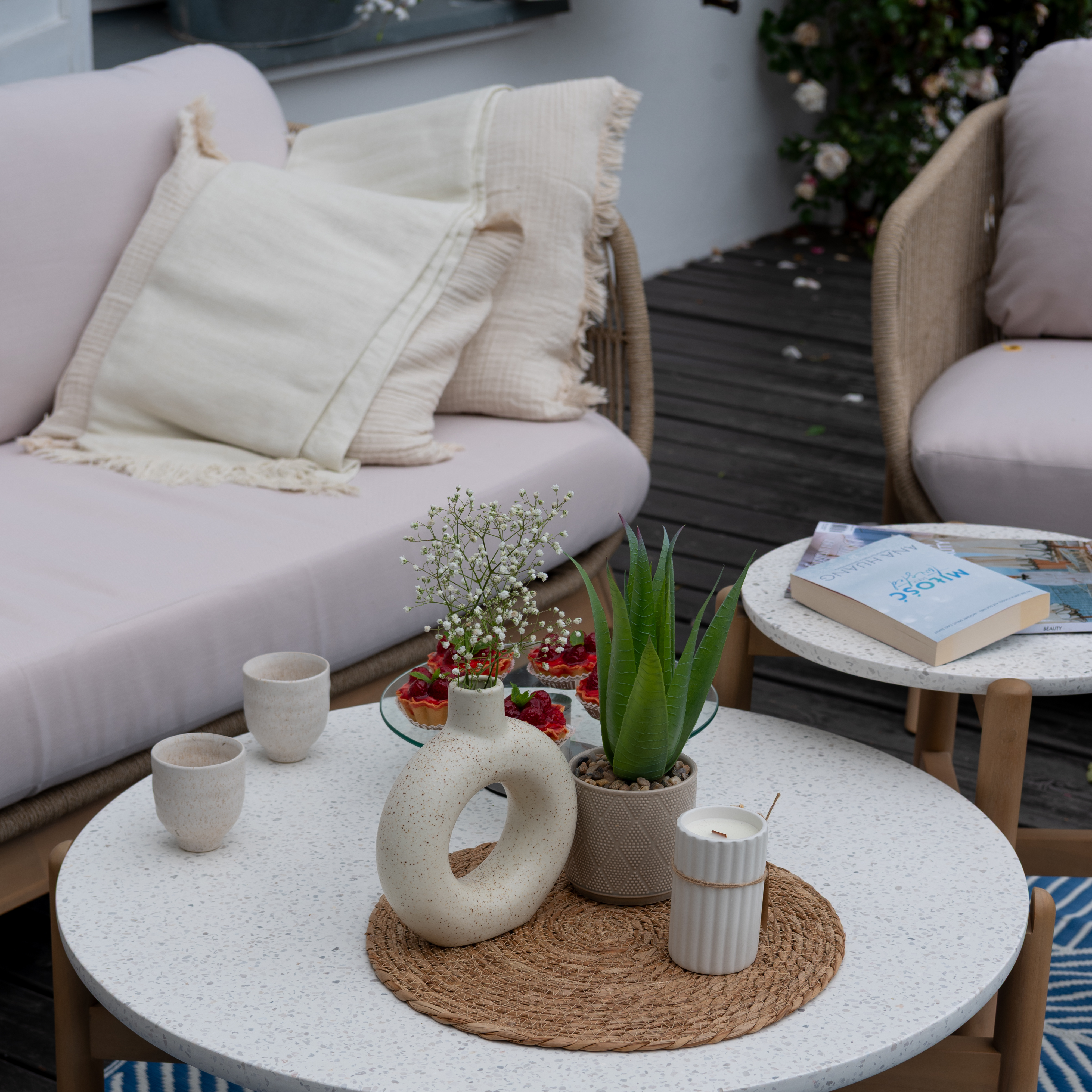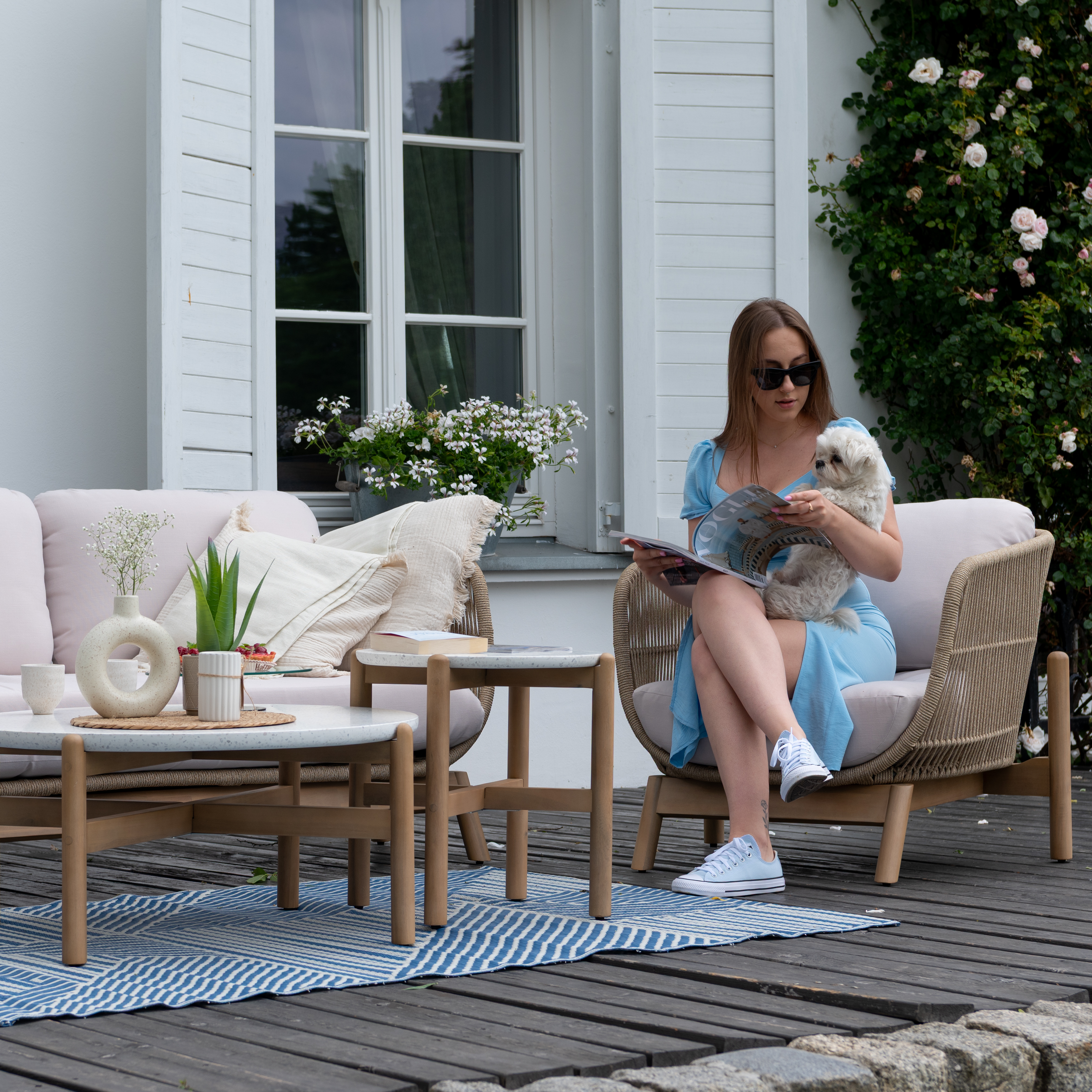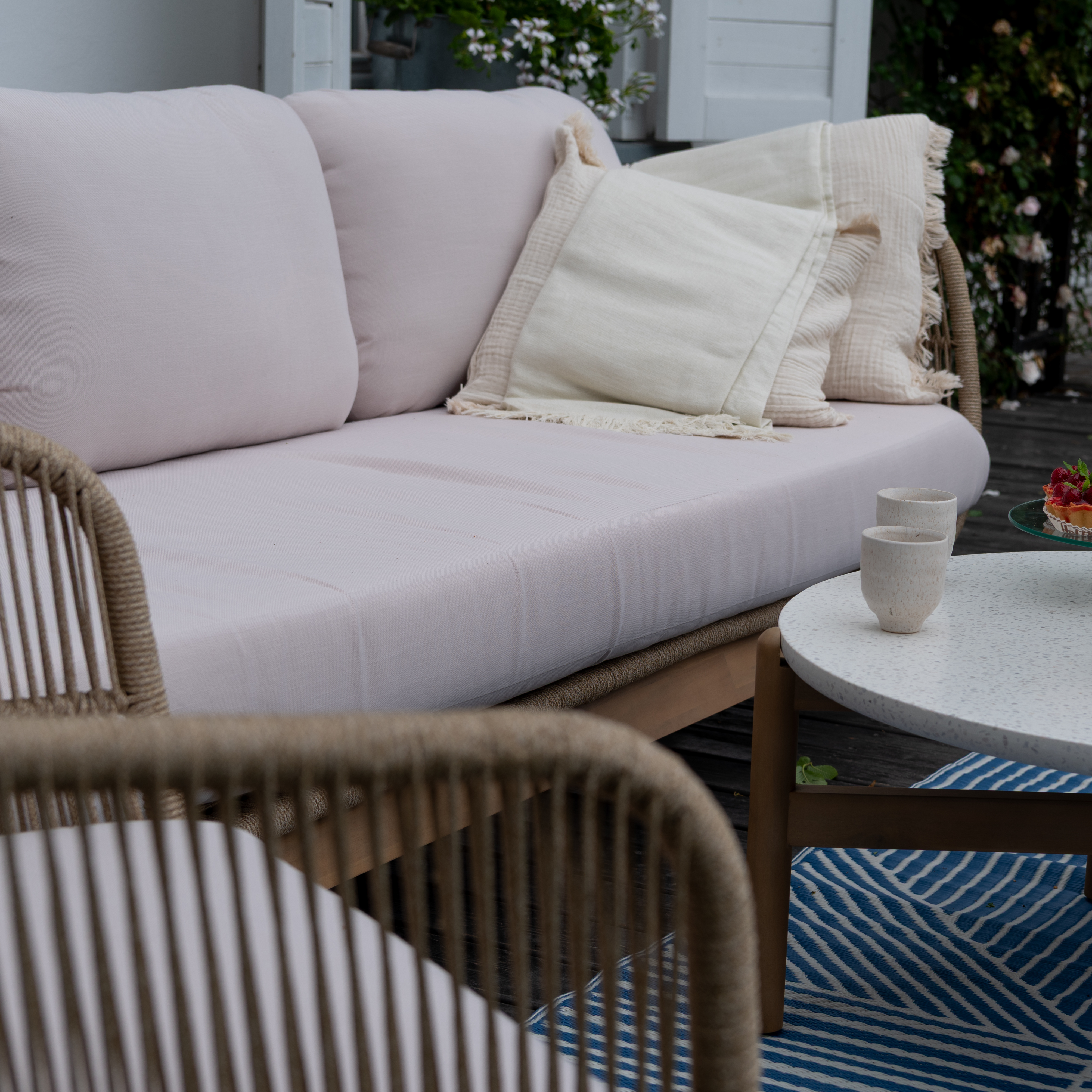 Zestaw tarasowy Ankara Max Caffe marki Furrore to stylowe połączenie najwyższej jakości drewna akacjowego w odcieniu jasnego teaku i plecionych nylonowych linek. Komplet składa się z dużej, trzyosobowej sofy, dwóch wygodnych foteli oraz dwóch stolików kawowych. Grube, miękkie poduszki w beżowym odcieniu zapewniają komfort, a solidna konstrukcja gwarantuje trwałość na wiele sezonów na zewnątrz – idealny wybór na taras i do ogrodu.
