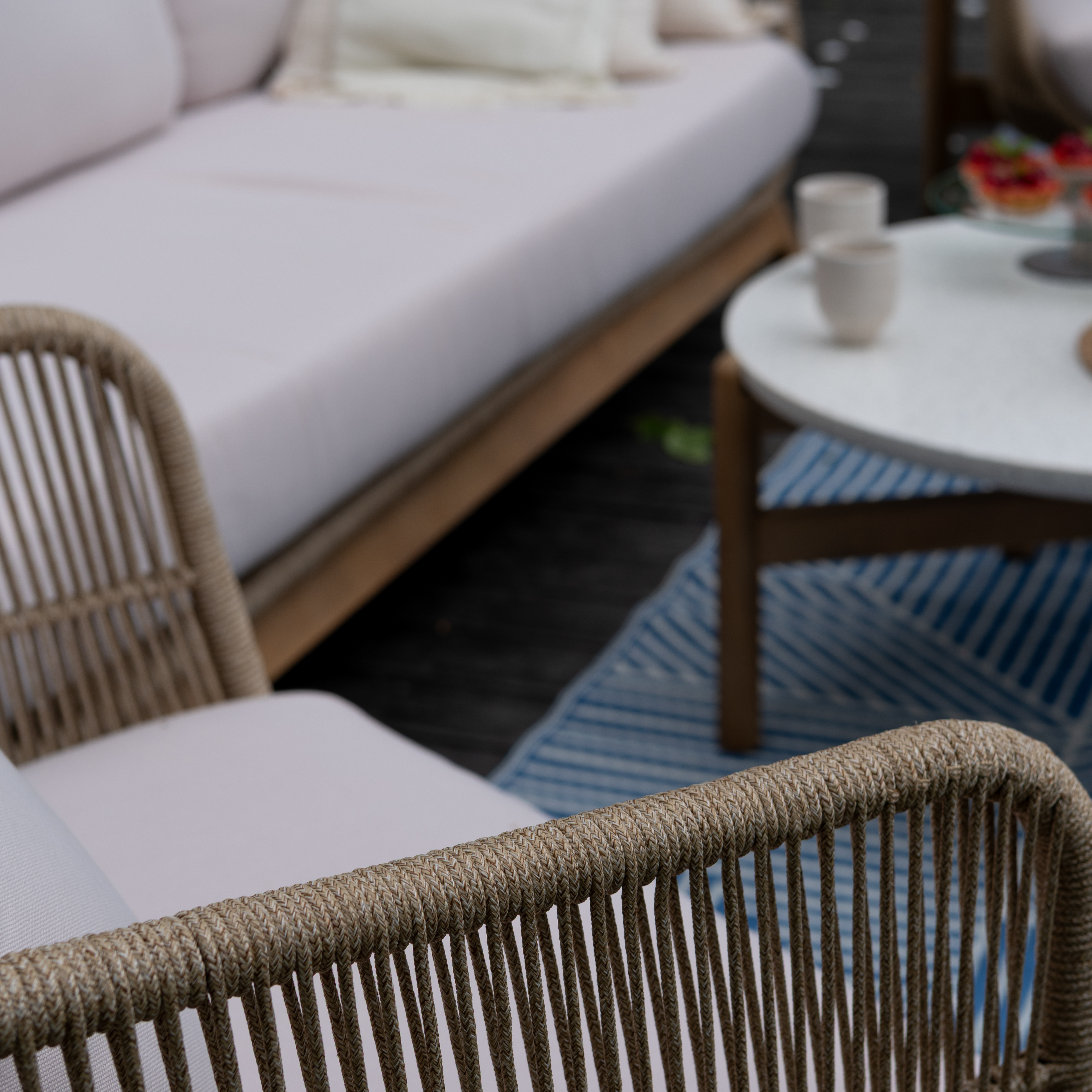 Konstrukcja mebla opiera się na solidnej ramie z litego drewna akacjowego, gwarantującej stabilność oraz odporność na czynniki zewnętrzne. Przemyślany projekt, wzmocnione łączenia i precyzyjne dopasowanie elementów wpływają na trwałość i niezawodność zestawu. Oparcia wykonane z dekoracyjnej plecionki z wytrzymałego sznurka nylonowego dodają lekkości wizualnej i podnoszą komfort użytkowania.