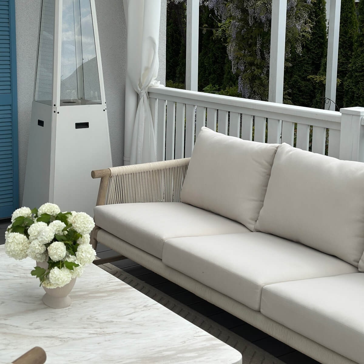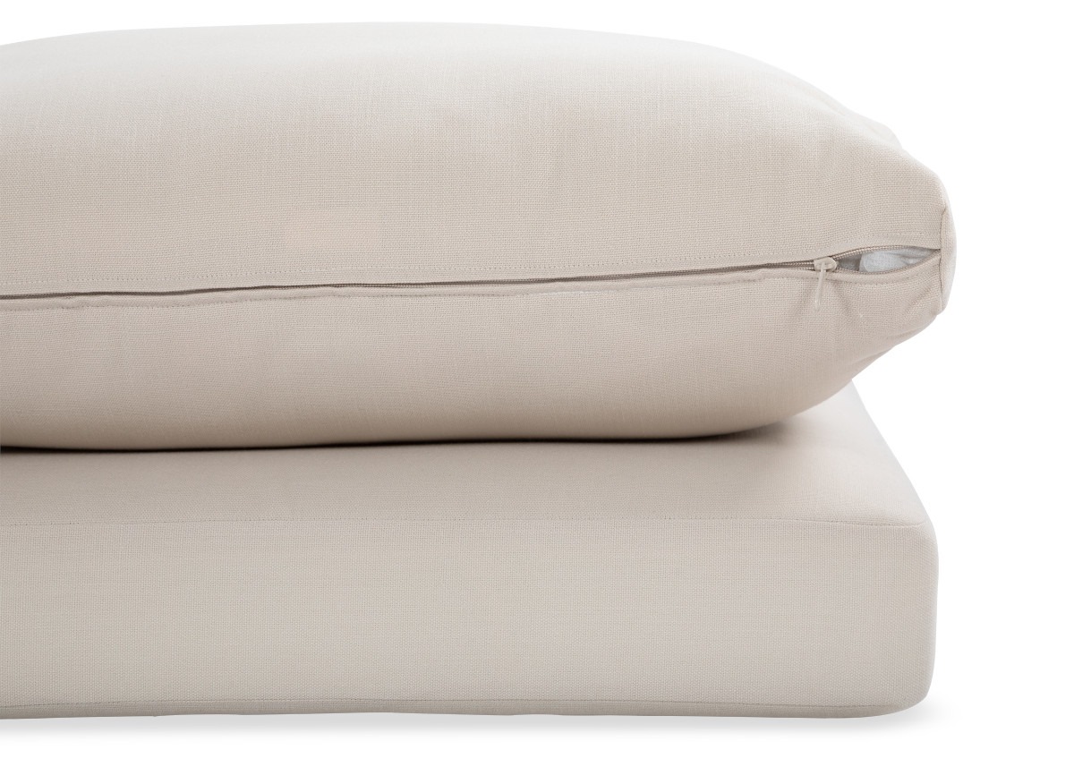 Tkanina wykonana z poliestrowej przędzy typu spun slub (250 g/m²) łączy naturalny wygląd lnu z wytrzymałością materiału syntetycznego. Jej subtelnie nieregularna faktura nadaje całości elegancki, tekstylny wygląd. Materiał cechuje się odpornością na mechacenie, słabiej chłonie wilgoć i szybko wysycha. Idealnie nadaje się do sezonowego użytku na zewnątrz, szczególnie pod zadaszeniem lub w osłoniętych miejscach.