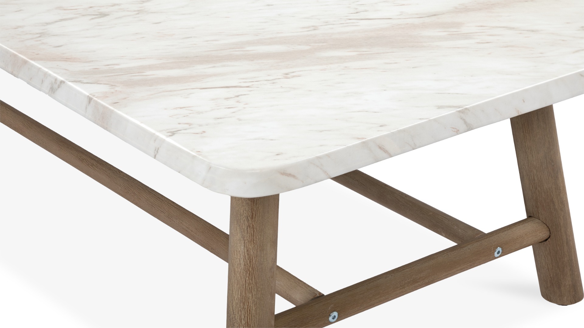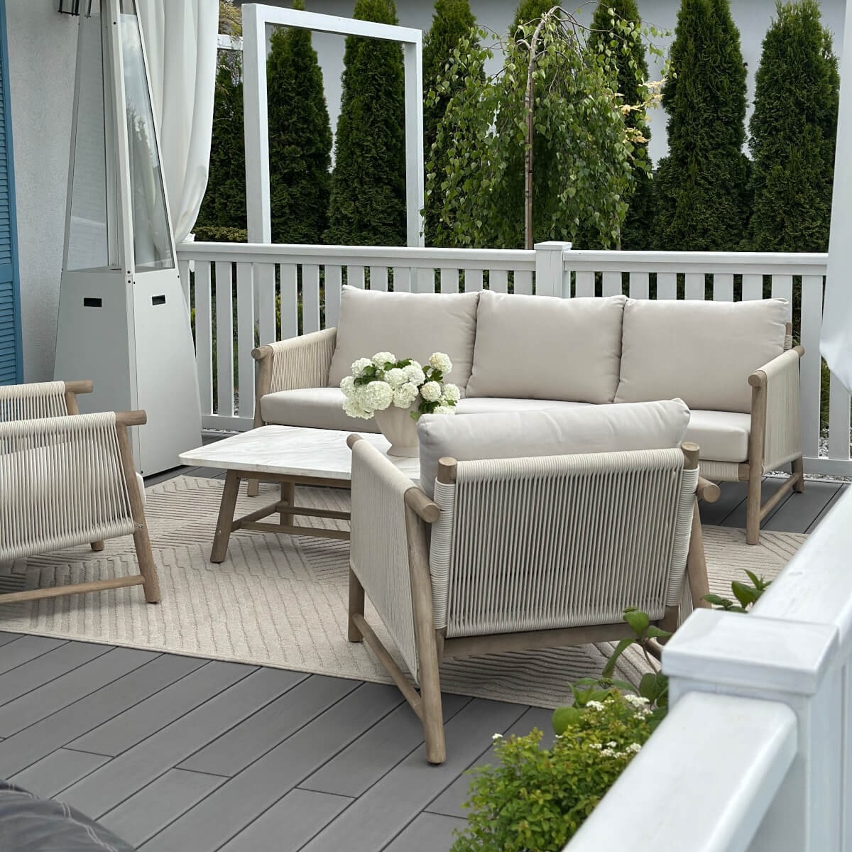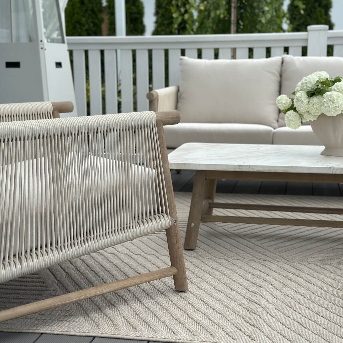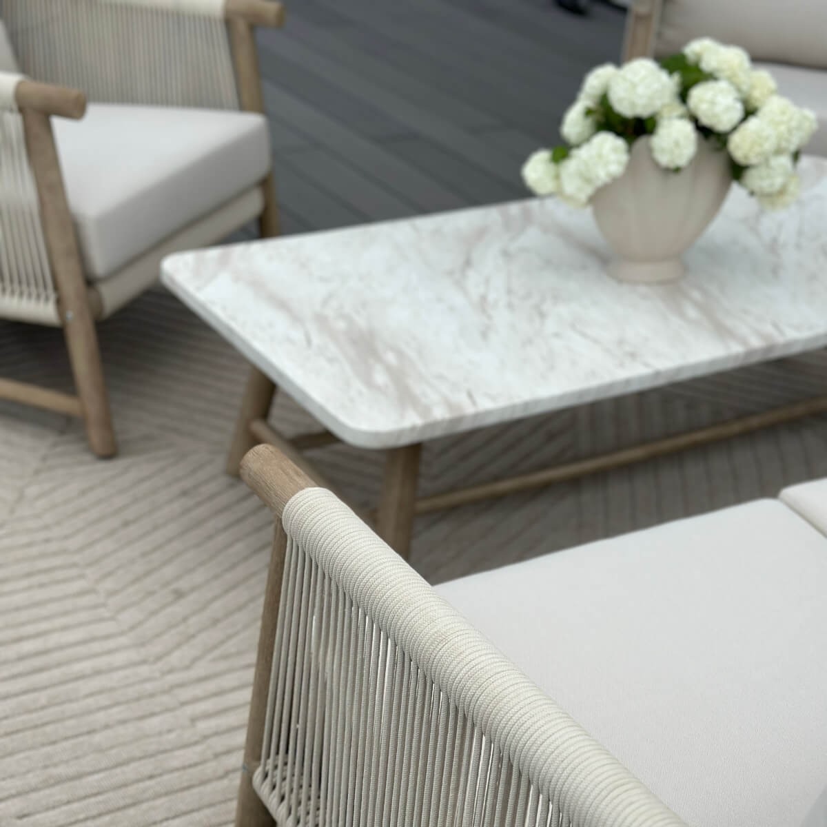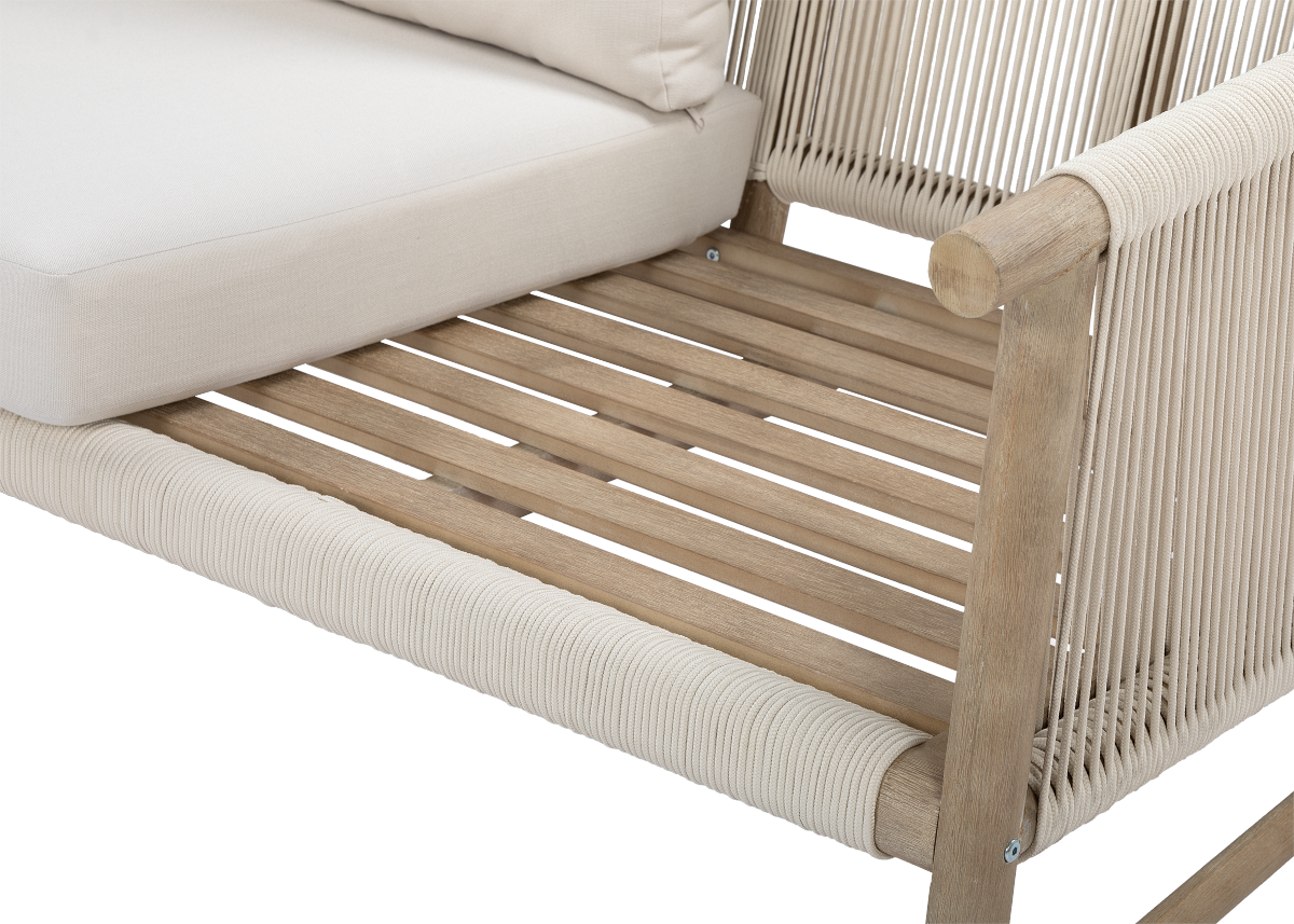 Konstrukcja mebla opiera się na solidnej ramie z litego drewna eukaliptusowego, gwarantującej stabilność oraz odporność na czynniki zewnętrzne. Przemyślany projekt, wzmocnione łączenia i precyzyjne dopasowanie elementów wpływają na trwałość i niezawodność zestawu. Oparcia wykonane z dekoracyjnej plecionki z wytrzymałego sznurka nylonowego dodają lekkości wizualnej i podnoszą komfort użytkowania.
