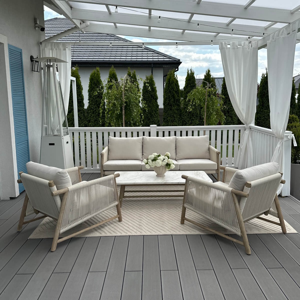 Zestaw ogrodowy Legend Caffe marki Furrore to stylowe i funkcjonalne rozwiązanie do wypoczynku na świeżym powietrzu. W jego skład wchodzi sofa, dwa fotele i stolik kawowy. Konstrukcja mebli została wykonana z trwałego drewna eukaliptusowego, odpornego na warunki atmosferyczne. Plecione oparcia ze sznurka nylonowego nadają lekkości formie i podkreślają nowoczesny charakter zestawu – idealnego na taras lub do ogrodu.