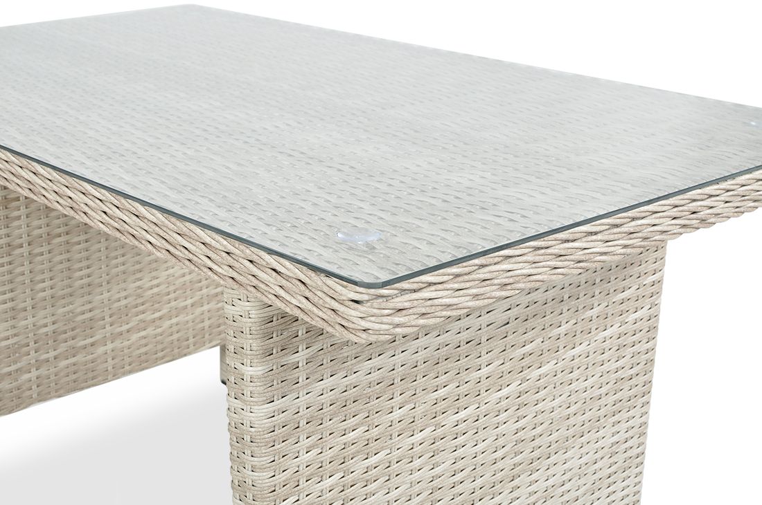 Blat stołu pokrywa hartowane szkło o grubości 5 mm, które zapewnia nie tylko estetykę, ale i bezpieczeństwo. Odporne na uszkodzenia i zarysowania, idealnie sprawdzi się w codziennym użytkowaniu. Dzięki przezroczystości szkła widoczna jest elegancka struktura plecionki.