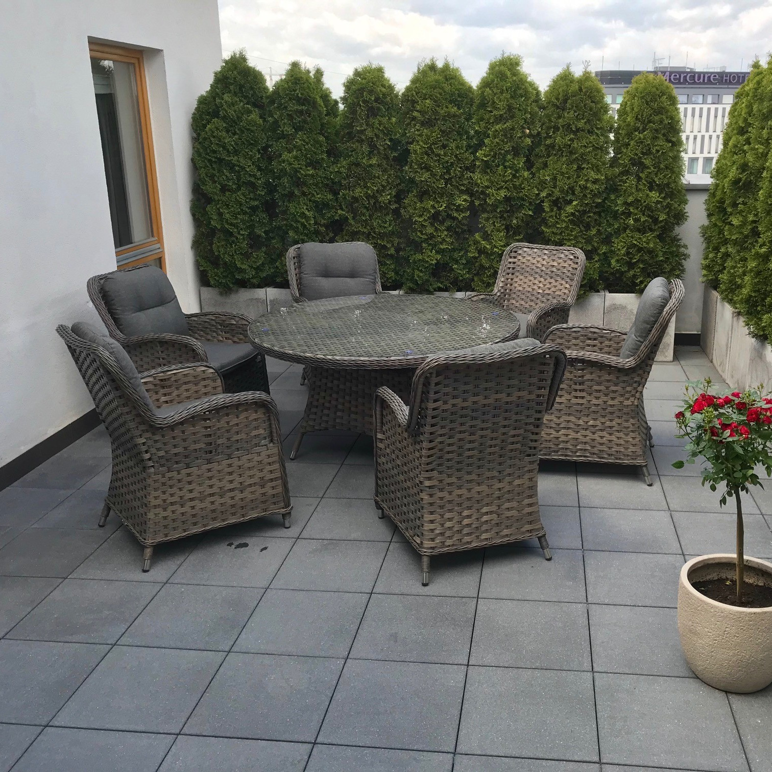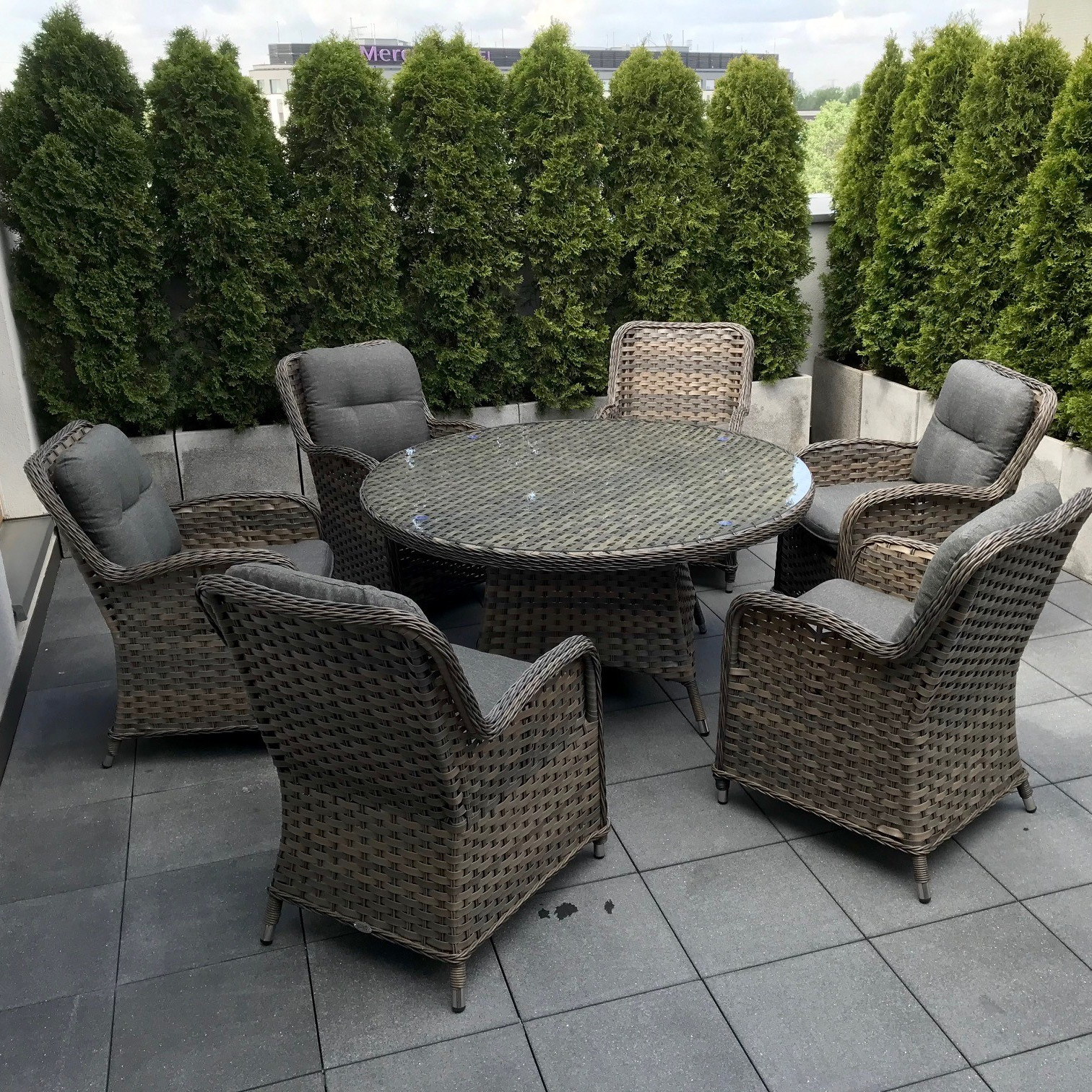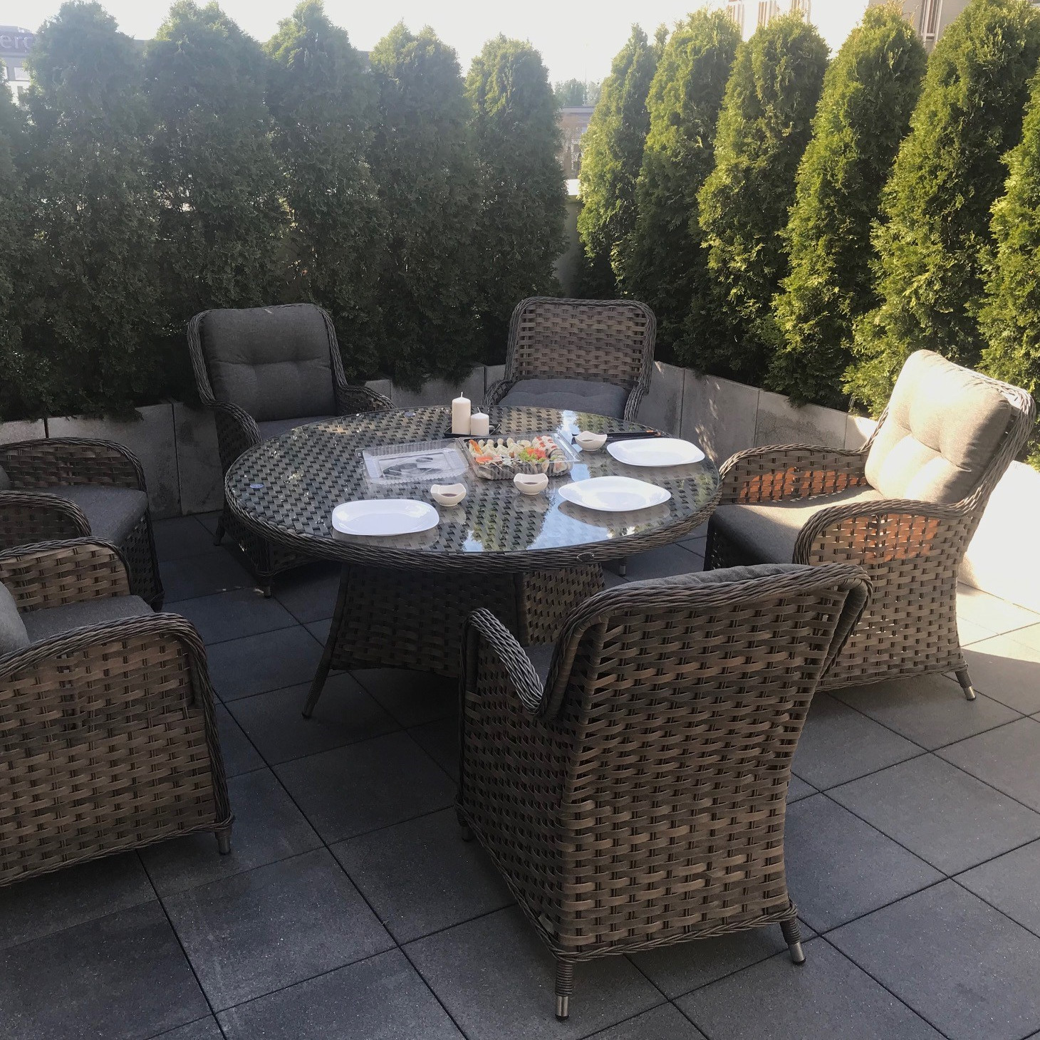Marzysz o przytulnym kąciku do relaksu i ponad wszystko cenisz sobie elegancję i jakość? Zestaw mebli ogrodowych BARCELONA Melange pomoże Ci stworzyć idealną przestrzeń wypoczynkową! Do produkcji mebli wykorzystano lekką i niepodatną na korozję konstrukcję aluminiową (malowaną proszkowo), a także niezwykle odporny na niekorzystne działania atmosferyczne technorattan. Zestaw składa się z 6 wygodnych foteli oraz dużego, okrągłego stołu o średnicy 140 cm pokrytego blatem ze szkła hartowanego o grubości 5 mm. Meble posiadają wygodne poduszki oparciowe i siedziskowe zwiększające komfort użytkowania. Wykorzystane materiały sprawiają, że komplet jest lekki, stabilny i łatwy w utrzymaniu czystości – wystarczy przetrzeć go wilgotną ściereczką, a pokrowce poduszek uprać w pralce. Mieszane faktury technorattanu przypominają naturalny materiał i idealnie komponują się z ogrodową zielenią, natomiast uniwersale połączenie kolorystyczne pozwoli na dopasowanie zestawu do niemal każdej aranżacji. Dzięki zastosowaniu technorattanu i malowanego proszkowo aluminium meble charakteryzują się najwyższą odpornością na działanie niekorzystnych warunków: wiatru, wody, wilgoci, promieniowania UV, zmiennych temperatur. Zestaw nie blaknie, jego powierzchnie nie odkształcają się, co pozwoli na wielosezonowe użytkowanie.