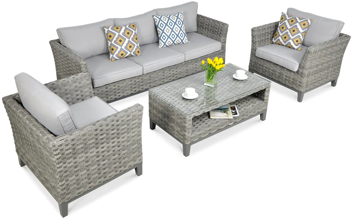 Komplet mebli technorattanowych Malaga Caffe Grey to luksusowy i oryginalny zestaw składający się z dużej 3-osobowej sofy, 2 foteli oraz stolika kawowego z półką. Jego wyjątkowość podkreśla specjalnie zaprojektowana rama nóg z efektem malowania pędzlem oraz nowoczesna, szeroka plecionka rattanowa. Zestaw Malaga Caffe Grey wykazuje się pełną odpornością na promieniowanie UV, deszcz, śnieg i inne kaprysy pogody. Ponadto technorattanowa plecionka w kolorze szarym, doskonale widoczna w całym zestawie Malaga Caffe, wygląda jak naturalny materiał, na żywo prezentuje się jeszcze lepiej, niż na zdjęciach! Przydatne właściwości oraz fantastyczny wygląd sprawiają, że technorattanowe meble ogrodowe z zestawu Malaga Caffe Grey sprawdzą się w każdych warunkach, zarówno na zewnątrz, jak też stałe wyposażenie salonu bądź jadalni. Zestaw mebli Malaga Caffe gwarantuje Ci komfort na wysokim poziomie i to nie tylko z powodu poduszek na wszystkie siedziska oraz oparcia, ale też samą konstrukcję. Meble są stosunkowo lekkie, co ułatwia przenoszenie ich z miejsca na miejsce. Zastosowanie solidnego stelaża z aluminium daje efekt w postaci niskiej wagi przy zachowaniu dużej wytrzymałości i solidności.