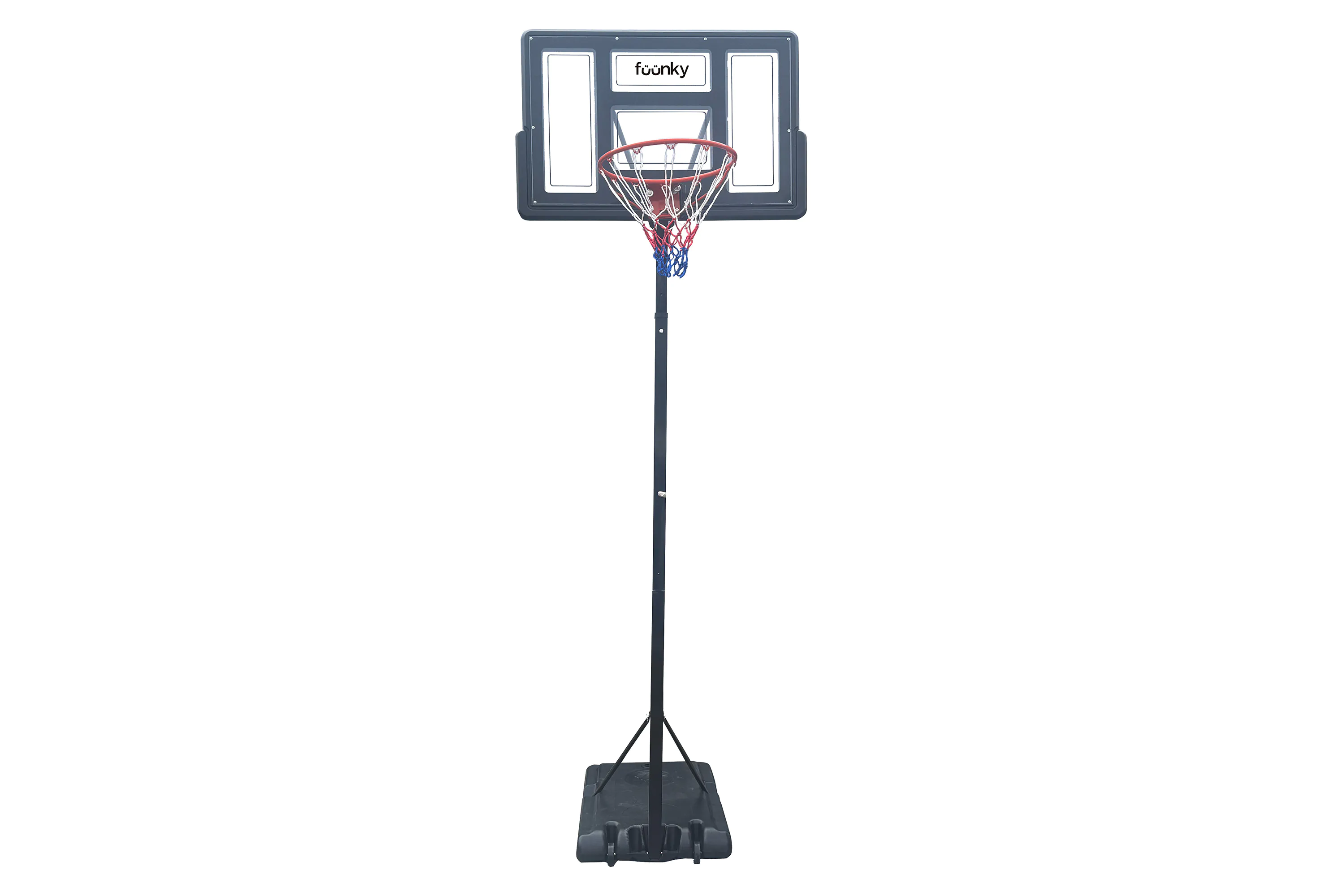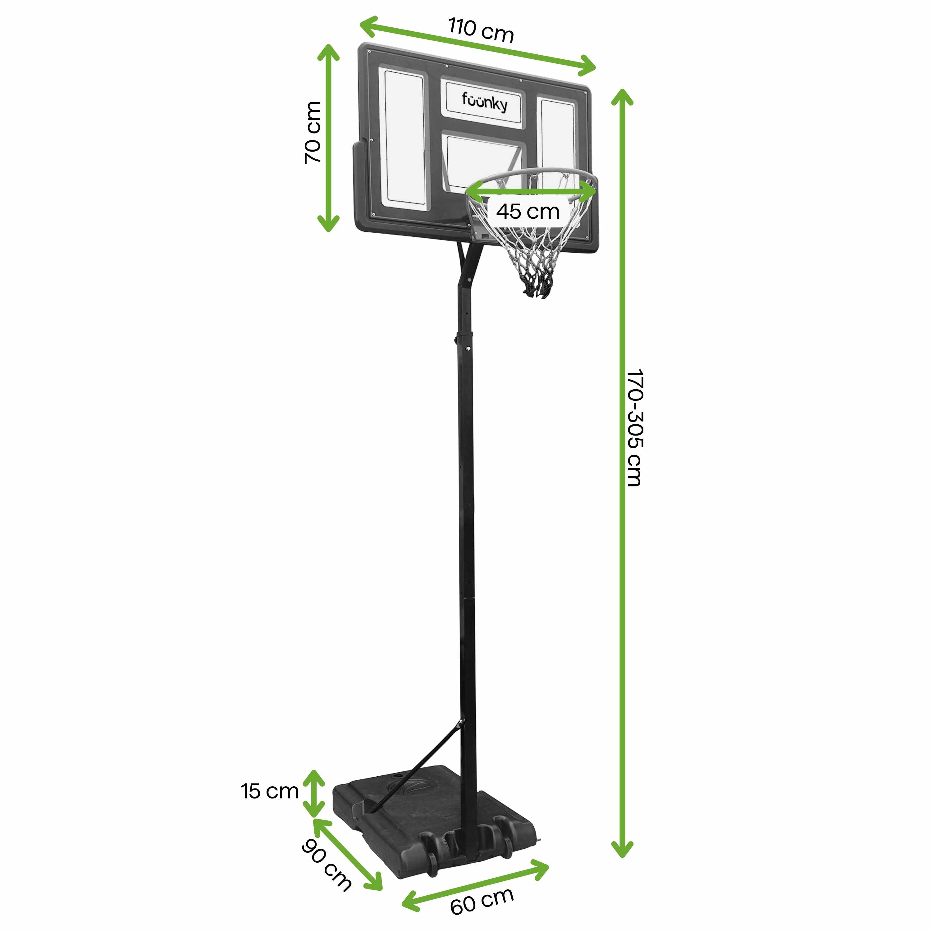 Mobilny kosz do koszykówki na ogród marki Fuunky z regulacją wysokości od 170 do 305 cm to wszechstronny zestaw rekreacyjny dla całej rodziny – sprawdzi się w ogrodzie, na podjeździe, boisku szkolnym czy rekreacyjnym. Tablica o wymiarach 110 × 70 cm wykonana z materiału PET z krawędziami PE zapewnia dobrą widoczność i odporność na uderzenia. Mobilna podstawa wyposażona w dwa kółka transportowe umożliwia łatwe przestawienie zestawu bez jego demontażu, a zbiornik, który należy wypełnić wodą lub piaskiem, zapewnia stabilność podczas użytkowania.