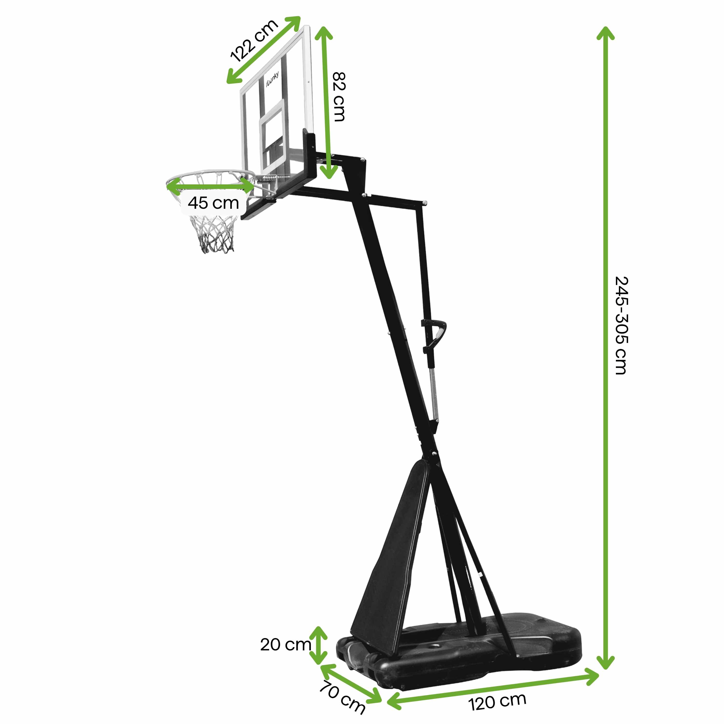 Mobliny kosz do koszykówki na ogród 245-305 cm od Fuunky to propozycja dla tych, którzy chcą cieszyć się prawdziwymi sportowymi emocjami we własnym ogrodzie. Dzięki regulacji wysokości obręczy w zakresie od 245 do 305 cm kosz z łatwością dostosowuje się do wieku i wzrostu gracza. Przezroczysta tablica wykonana z poliwęglanu (PC) ze stalową krawędzią zapewnia doskonałą widoczność, a trzyczęściowy stalowy słup pokryty czarną powłoką proszkową gwarantuje trwałość przez wiele sezonów. Produkt posiada certyfikat CE i spełnia wymagania bezpieczeństwa przewidziane dla tego typu urządzeń sportowych. Montaż wymaga udziału dwóch dorosłych osób.