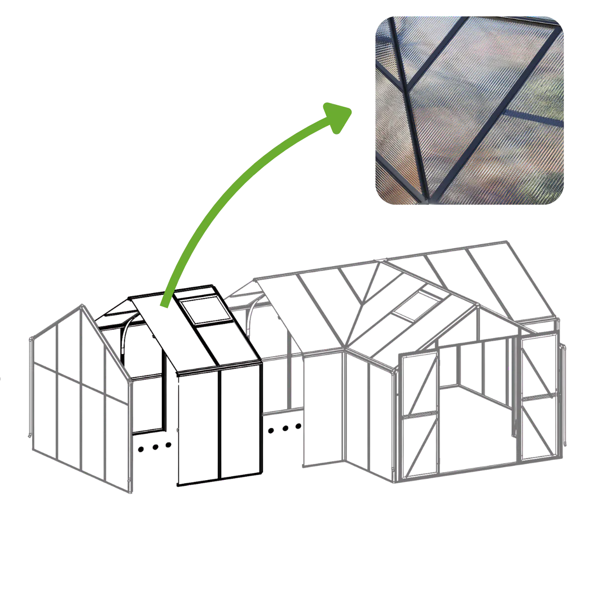 Otwierane otwory wentylacyjne w module rozszerzającym poprawiają cyrkulację powietrza, tworząc roślinom idealne warunki do wzrostu i utrzymując zdrowy mikroklimat w oranżerii przez cały rok.