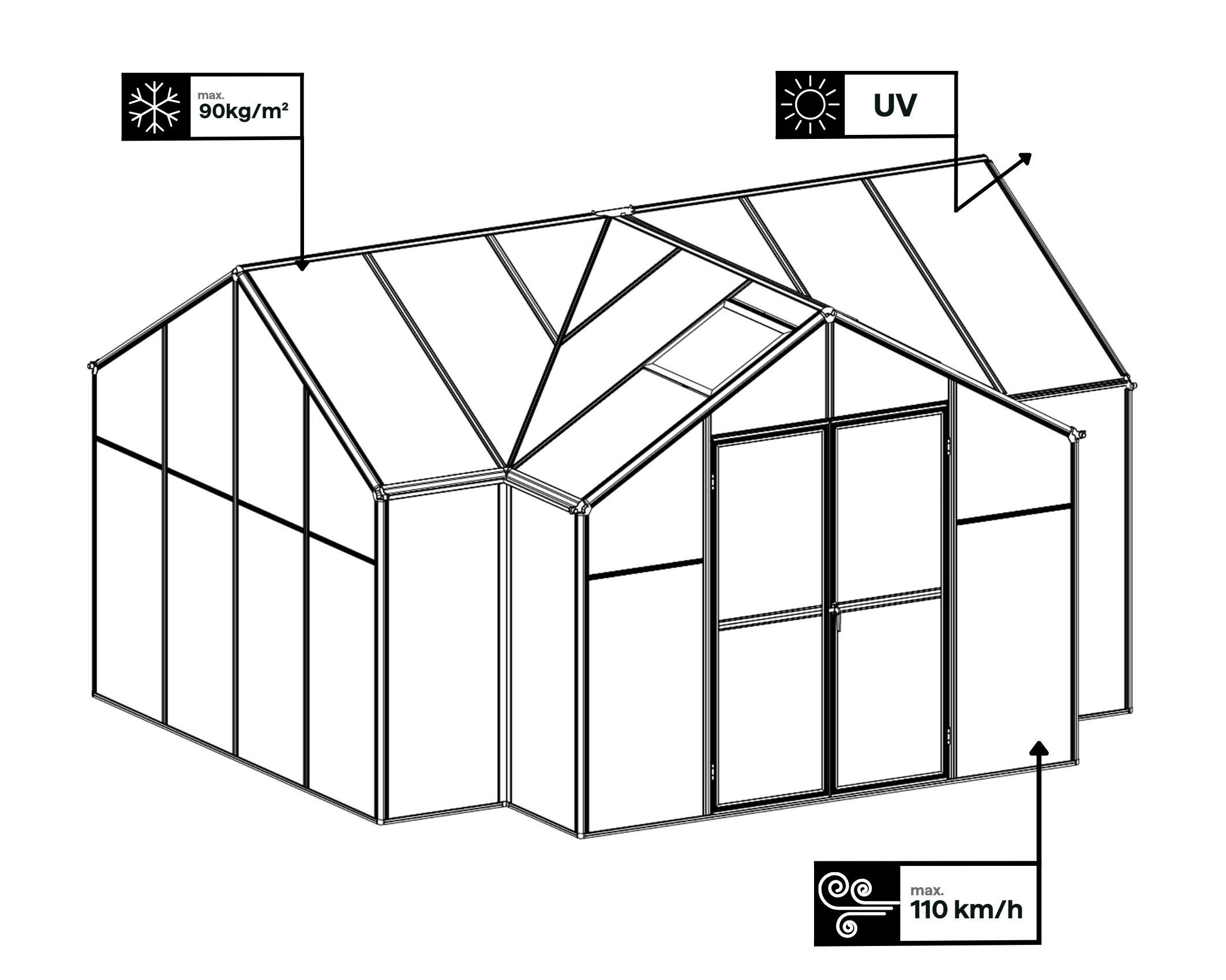Moduł rozszerzający do ogrodu zimowego TRIBECA PC + Glass 287x144 cm od Gutroof to praktyczne rozwiązanie umożliwiające powiększenie przestrzeni o dodatkowe 144 cm. Moduł jest w pełni kompatybilny z systemem rynnowym szklarni, co gwarantuje skuteczne odprowadzanie wody deszczowej. Segment wykonano z takich samych materiałów jak cała konstrukcja – wytrzymałych profili aluminiowych 1 – 2 mm malowanych proszkowo, szkła hartowanego o grubości 4 mm oraz paneli z poliwęglanu o grubości 6 mm. Dzięki temu oranżeria zachowuje spójny wygląd, trwałość i odporność na warunki atmosferyczne. Powiększ swój ogród zimowy bez konieczności kupowania nowej konstrukcji! Nasz moduł rozszerzający gwarantuje elastyczne dopasowanie wielkości oranżerii do Twoich rosnących potrzeb. Zalecamy dodanie maksymalnie 3 modułów, aby uzyskać dodatkową powierzchnię w oranżerii. Podczas montażu modułu należy dokładnie dokręcić wszystkie śruby i łączniki. To działanie znacząco zwiększy stabilność oraz ogólne bezpieczeństwo całej konstrukcji.