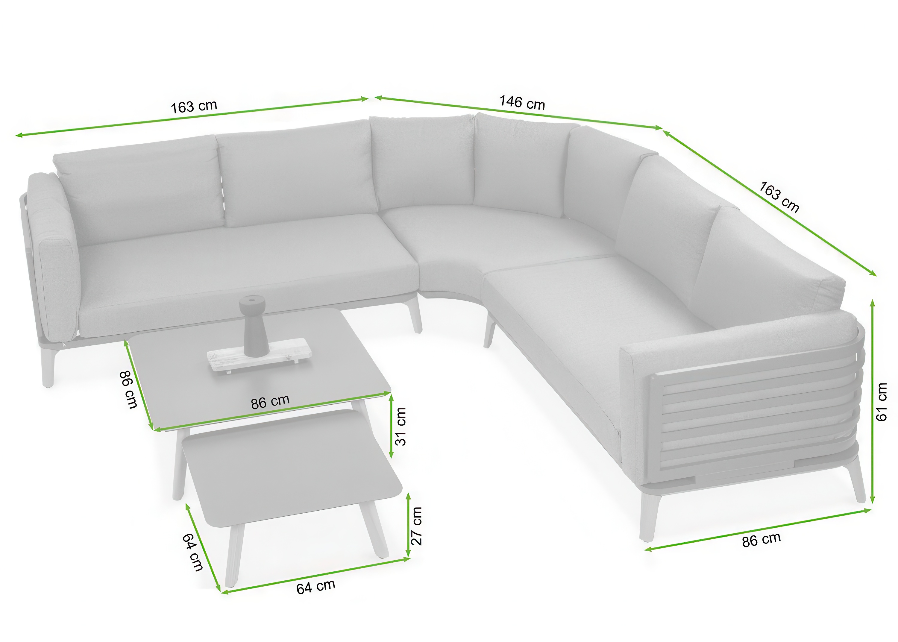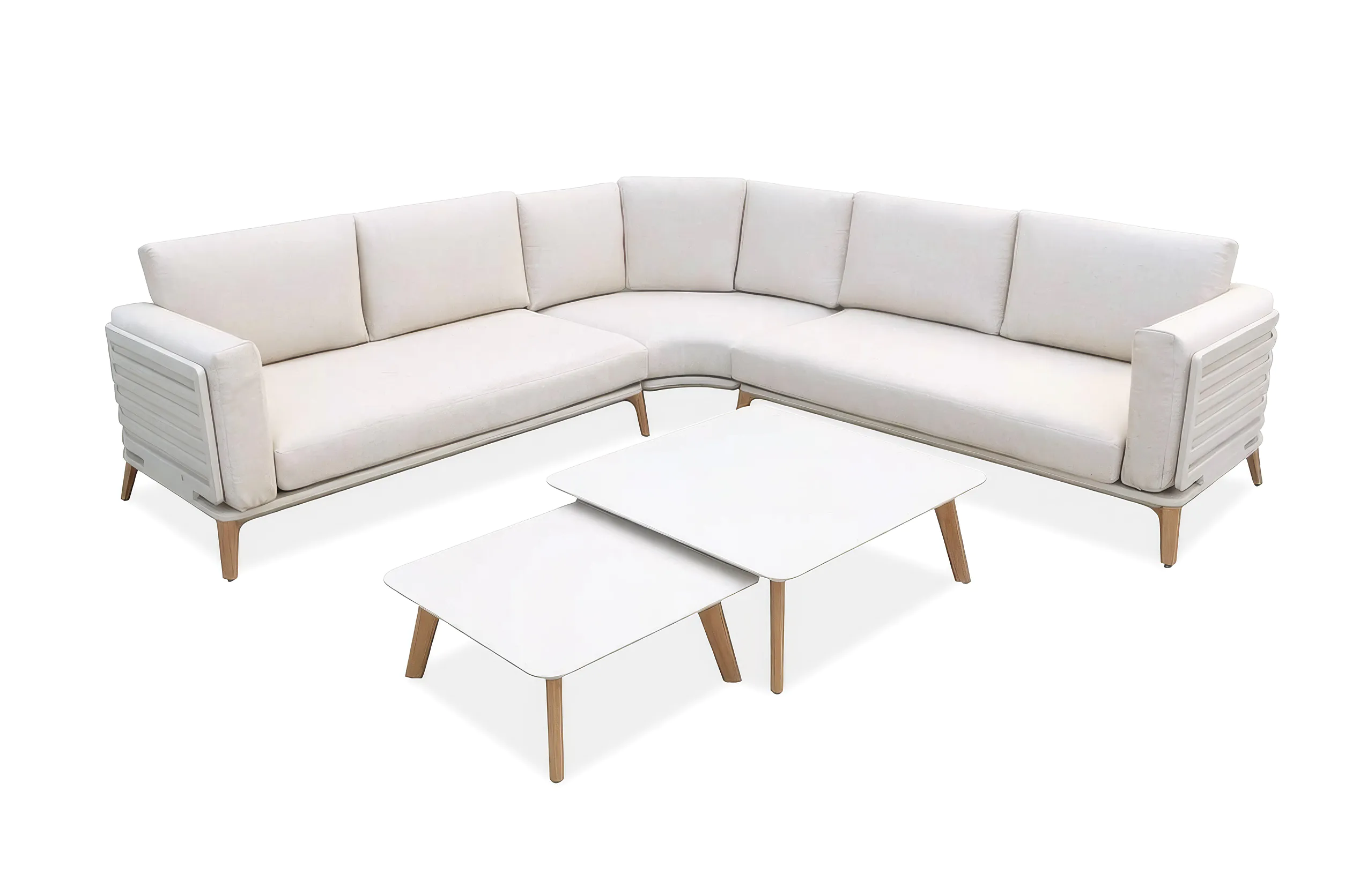 Narożnik do ogrodu RADISSON CAFFE Beige – Furrore to stylowy i wygodny 5-częściowy zestaw wypoczynkowy, idealny do ogrodu, na taras lub balkon, który pozwala stworzyć przytulną strefę relaksu i spotkań towarzyskich. W skład kompletu wchodzą dwie sofy z lewym i prawym podłokietnikiem oraz sofa narożna, które razem tworzą funkcjonalny narożnik, a także dwa stoliki kawowe o różnych wymiarach. Meble wykonane są z lekkiego i trwałego aluminium, zapewniającego stabilność oraz odporność na codzienne użytkowanie, a wysokie, lekko pochylone, drewnopodobne nóżki dodają całości eleganckiego i nowoczesnego charakteru. Komfort użytkowania gwarantują grube, 13-centymetrowe poduszki z poliestru przędzalniczego ze zdejmowanymi, łatwymi do prania pokrowcami. Stonowana kolorystyka w odcieniach beżu sprawia, że zestaw doskonale pasuje do aranżacji nowoczesnych, loftowych i skandynawskich, łącząc ponadczasowy styl z wysoką funkcjonalnością.