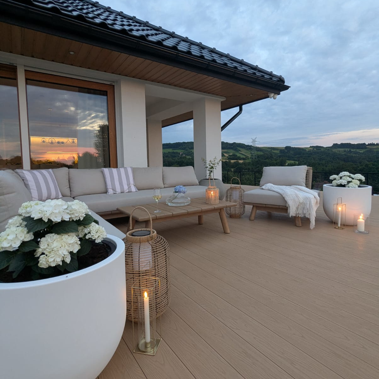 Naturalny odcień drewna TEAK 01A oraz beżowe dodatki stylistyczne doskonale wpisują się w estetykę nowoczesnych mebli ogrodowych, inspirowanych stylem skandynawskim i azjatyckim.