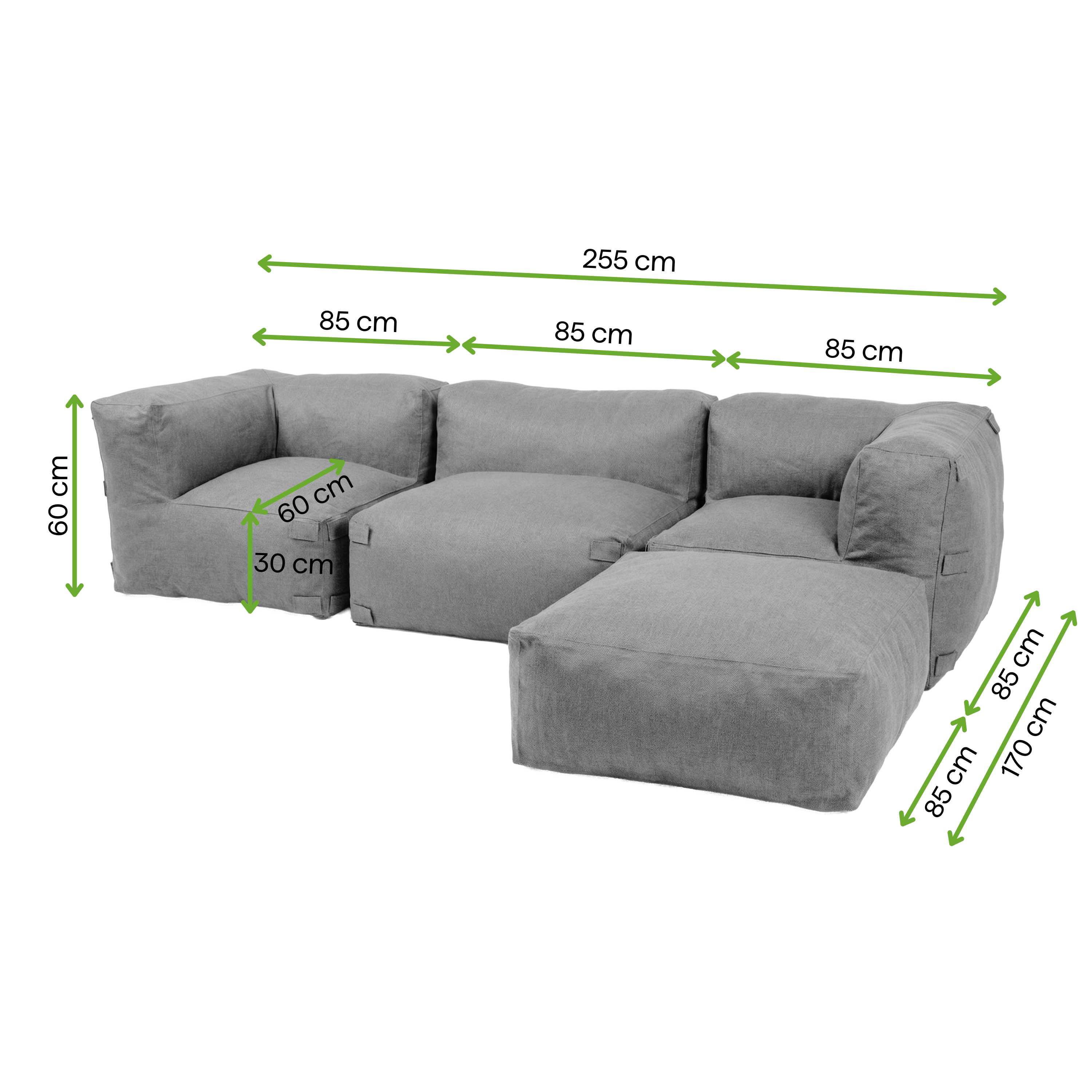 Narożnik modułowy na taras ALORA Standard Grey od Bjørkka to modułowy zestaw wypoczynkowy składający się z dwóch modułów narożnych, modułu środkowego oraz pufy, który pozwala elastycznie dopasować układ do przestrzeni tarasu, ogrodu lub patio. Elementy łączone są za pomocą rzepów, co stabilizuje konstrukcję podczas użytkowania, a wypełnienie z gąbki rozprężającej się zapewnia wygodne podparcie i powrót do pierwotnego kształtu po odciążeniu. Tapicerka z tkaniny olefin o gramaturze 242 g/m² posiada właściwości water repellent oraz odporność na promieniowanie UV, co ogranicza wchłanianie wilgoci i wspiera trwałość koloru w warunkach zewnętrznych, a zdejmowane pokrowce ułatwiają czyszczenie. Pufa może pełnić funkcję dodatkowego siedziska lub podnóżka, zwiększając komfort wypoczynku, a maksymalne obciążenie 110 kg na moduł potwierdza solidność i przystosowanie zestawu do codziennego użytkowania.