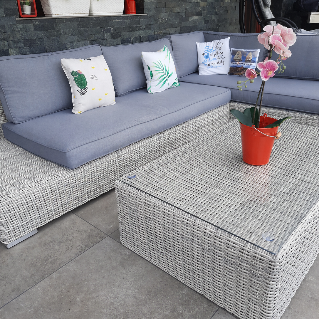 Narożnik z technorattanu VERONA White Grey rekomendujemy dla osób ceniących komfort oraz wyszukany i niepowtarzalny wygląd. Komplet składa się z dwóch modułów oraz stolika, które w wygodnych warunkach pozwolą wypić popołudniową kawę z przyjaciółmi lub rodziną. Zastosowane materiały zapewniają trwałość i odporność na warunki atmosferyczne, a eleganckie i gustowne wykończenia detali podkreślają jego wysoką jakość. Charakterystyczne przedłużenia modułów, powiększają optycznie zestaw nadając mu wyjątkowego uroku. Opcjonalnie mogą posłużyć jako półki na lekkie, drobne podręczne przedmioty Dla miłośników designu, gorąco polecamy.