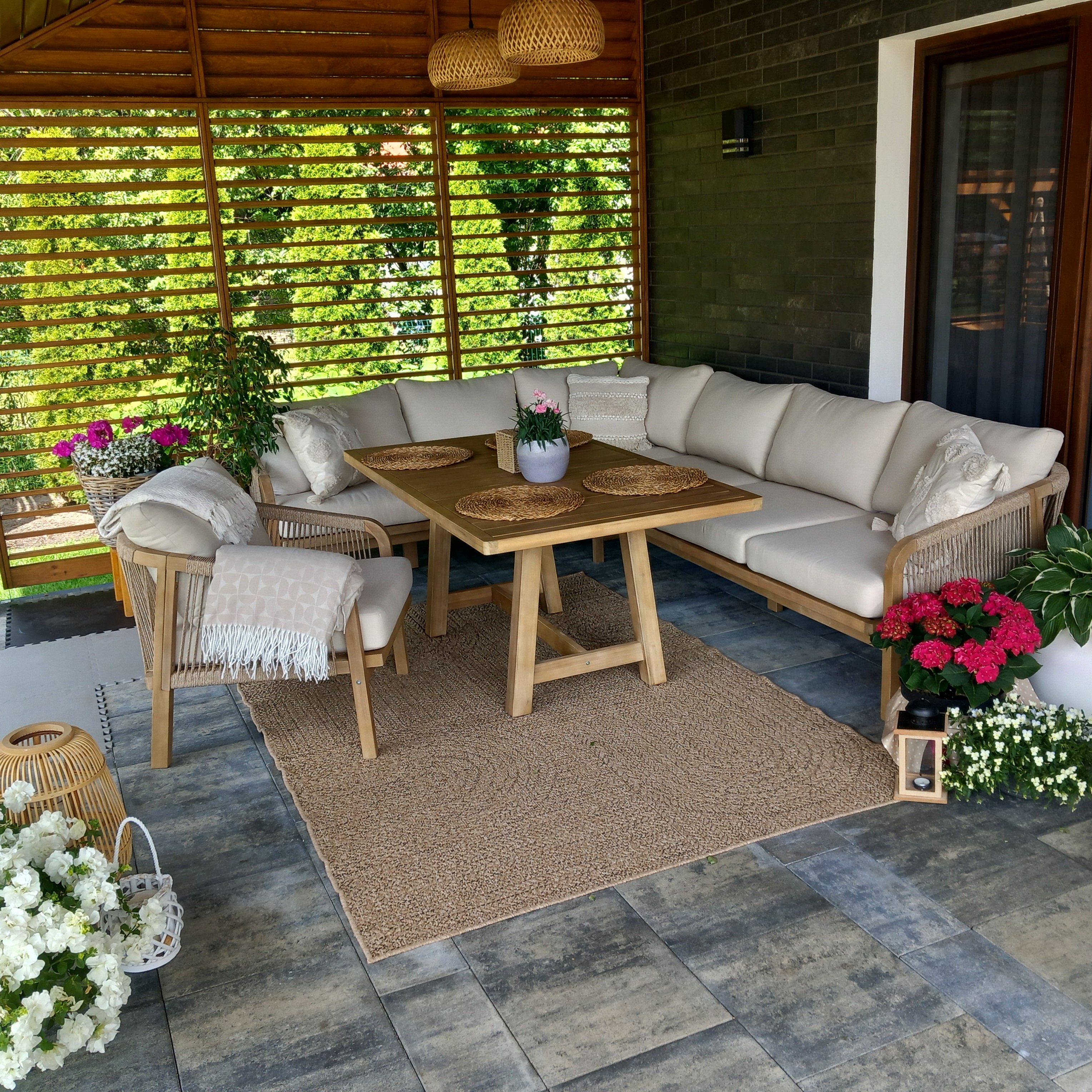 Zestaw narożnikowy Marigold Dining marki Furrore to 7-osobowy komplet mebli ogrodowych, wykonany z naturalnego drewna akacjowego. Drewniana konstrukcja łączy się z estetycznymi, ręcznie plecionymi elementami z nylonowego sznurka, a całość uzupełniają grube, komfortowe poduszki pokryte wytrzymałą tkaniną. Narożnik łączy elegancki wygląd z trwałością, idealnie sprawdzając się w ogrodowej przestrzeni, zapewniając wygodę dla całej rodziny.