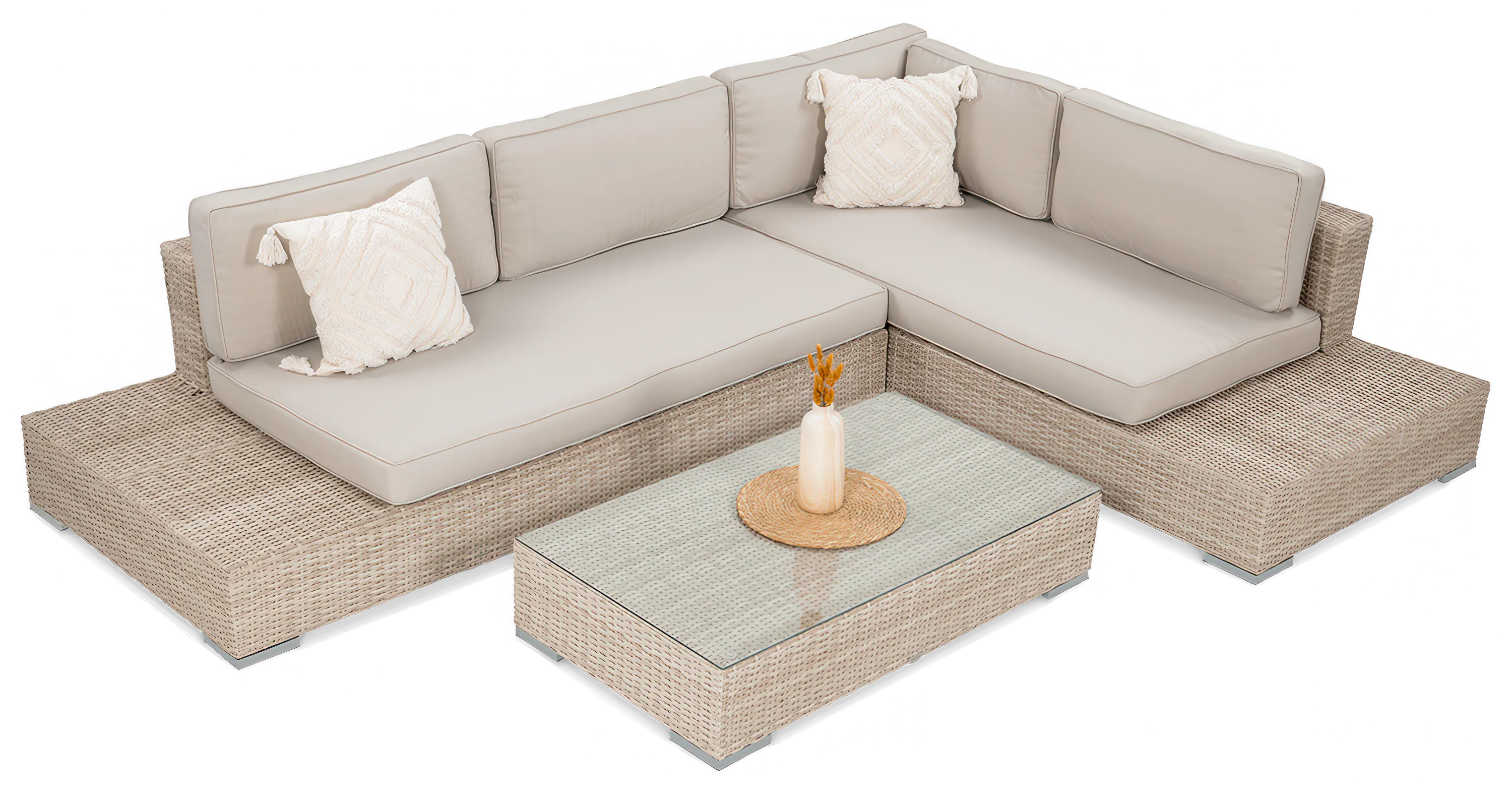 Narożnik z technorattanu VERONA Beige rekomendujemy dla osób ceniących komfort oraz wyszukany i niepowtarzalny wygląd. Komplet składa się z dwóch modułów oraz stolika, które w wygodnych warunkach pozwolą wypić popołudniową kawę z przyjaciółmi lub rodziną. Zastosowane materiały zapewniają trwałość i odporność na warunki atmosferyczne, a eleganckie i gustowne wykończenia detali podkreślają jego wysoką jakość. Charakterystyczne przedłużenia modułów, powiększają optycznie zestaw nadając mu wyjątkowego uroku. Opcjonalnie mogą posłużyć jako półki na lekkie, drobne podręczne przedmioty Dla miłośników designu, gorąco polecamy.