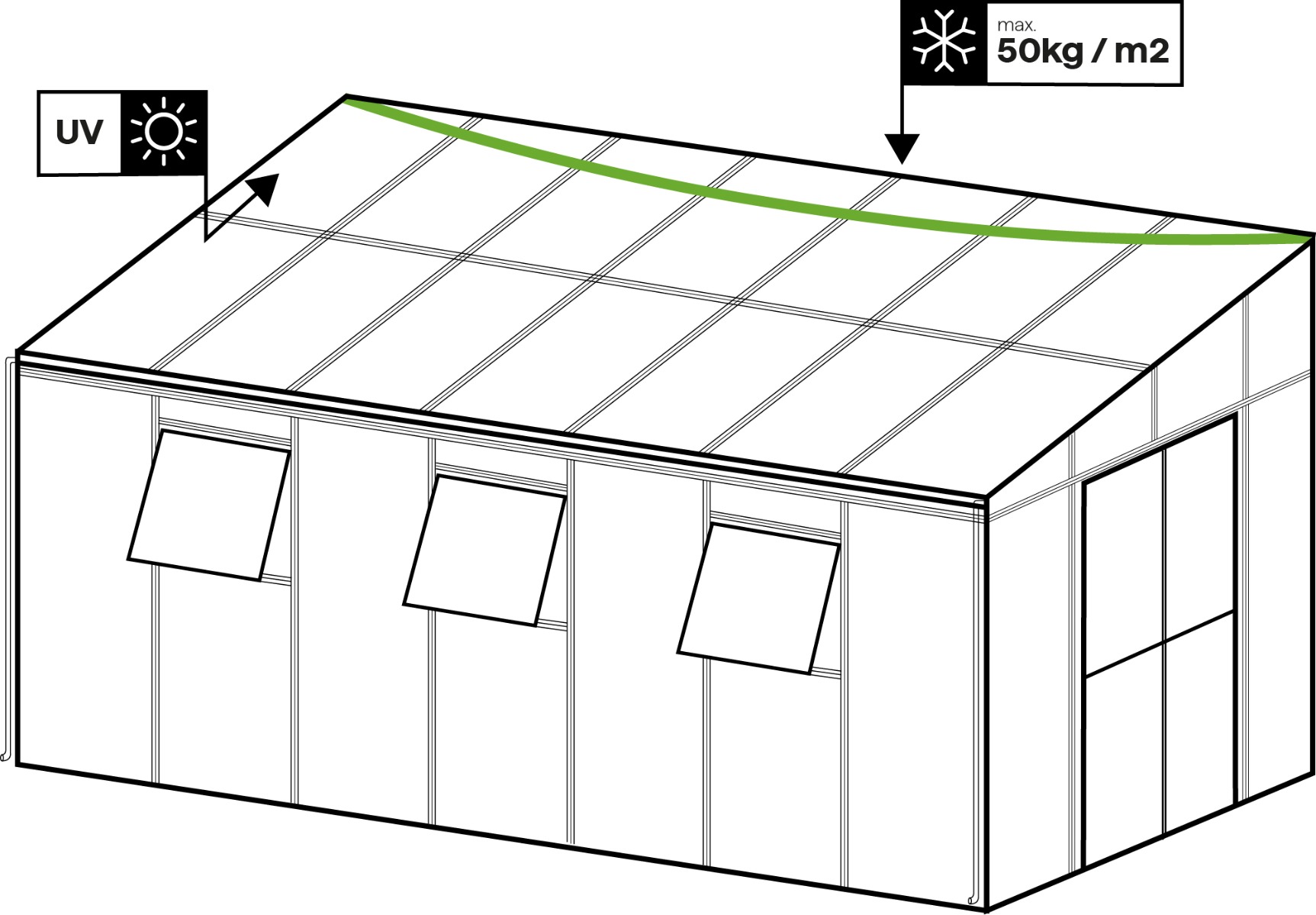 W celu zapewnienia szczelności konstrukcji, dach ogrodu zimowego należy uszczelnić odpowiednim silikonem (brak w zestawie). Najlepszy rozwiązaniem jest uszczelniacz dekarski hybrydowy lub kauczukowy.