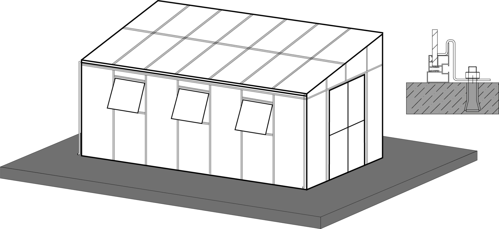 Aby zapewnić długowieczność i stabilność przyściennej oranżerii SOHO Black przed montażem należy zadbać o odpowiednie przygotowanie podłoża – powinno być równe, twarde i suche. Nowoczesny system montażu, który wykorzystuje fabrycznie zamontowane nakrętki w profilach aluminiowych, znacząco skraca czas instalacji, eliminując konieczność ręcznego osadzania śrub. Konstrukcja wyposażona jest w wsporniki kotwiące z wkrętami rozporowymi, które pozwalają na solidne zamocowanie oranżerii do betonowego podłoża, zwiększając jej odporność na warunki atmosferyczne.