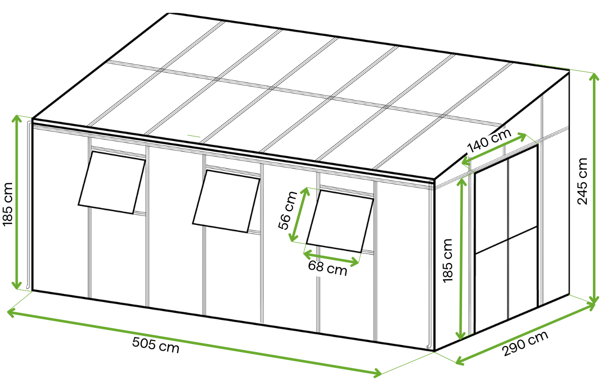 Stwórz w swoim ogrodzie przestrzeń pełną światła, komfortu i elegancji z przyścienną oranżerią SOHO Black 505x290 cm SOLID PC + Glass od Gutroof. To imponujące rozwiązanie łączy solidną konstrukcję z nowoczesnym designem, gwarantując wygodę użytkowania przez cały rok. Aluminiowe profile malowane proszkowo zapewniają trwałość i odporność na działanie warunków atmosferycznych. Ściany z hartowanego szkła 4 mm oferują doskonałą przejrzystość, a dach z litego poliwęglanu 2 mm nadaje oranżerii elegancki efekt tafli szkła, jednocześnie zapewniając wyjątkową odporność na uszkodzenia i promieniowanie UV.
