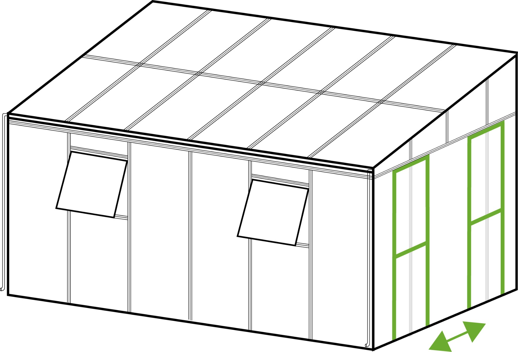 Oranżeria SOHO Black została wyposażona w przesuwne drzwi, które umożliwiają wygodne wejście bez ograniczania przestrzeni wokół konstrukcji. Mechanizm przesuwny pozwala na płynne i lekkie otwieranie, co znacznie ułatwia korzystanie z oranżerii nawet w miejscach o ograniczonej powierzchni.