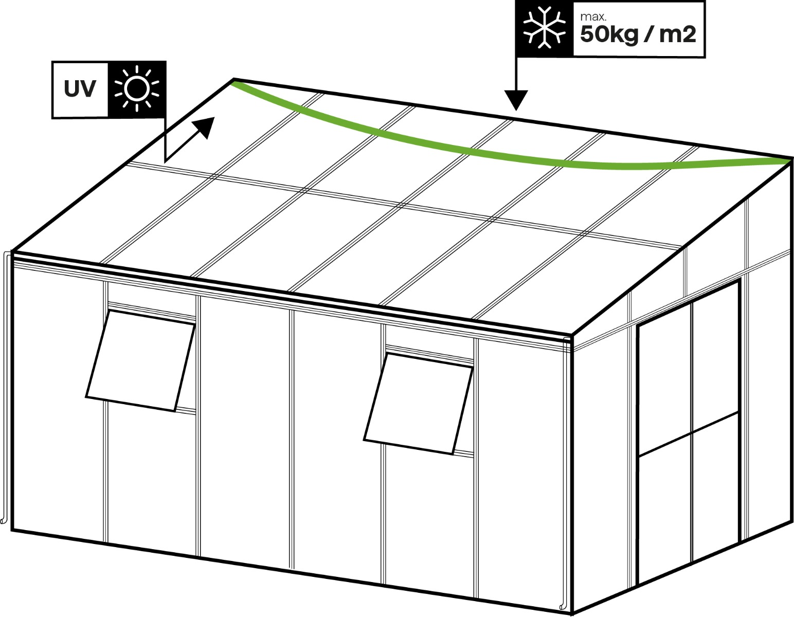 W celu zapewnienia szczelności konstrukcji, dach ogrodu zimowego należy uszczelnić odpowiednim silikonem (brak w zestawie). Najlepszy rozwiązaniem jest uszczelniacz dekarski hybrydowy lub kauczukowy.
