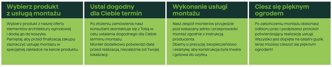 W Focus Garden zajmujemy się montażem dostępnych w naszym sklepie elementów architektury ogrodowej. Nasza doświadczona ekipa montażystów zapewnia fachowe podejście i terminowe wykonanie projektu. Przekonaj się, dlaczego nasze usługi to nie tylko montaż - to proces, w którym dbamy o każdy detal, starając się stworzyć przestrzeń dostosowaną do Twoich indywidualnych potrzeb.