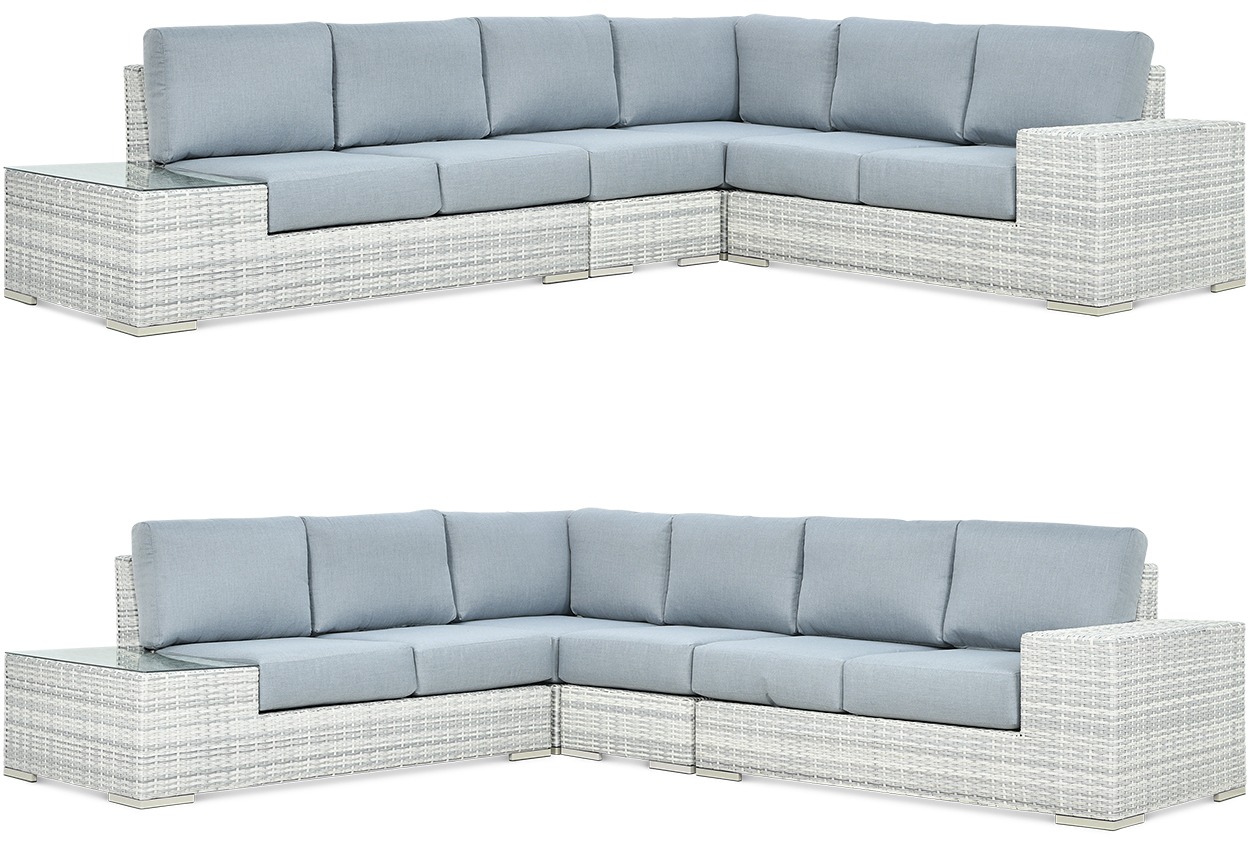 Avocado White Grey łączy subtelną kolorystykę z nowoczesnym designem, tworząc wyjątkową przestrzeń relaksu. Technorattan w odcieniu biało-szarym sprawia, że narożnik świetnie komponuje się z jasnymi aranżacjami. Aluminiowy szkielet i odporność na pogodę czynią go niezwykle trwałym. W komplecie miękkie poduszki i szklany stolik dla pełnej wygody. Idealny wybór do wnętrz i na zewnątrz.