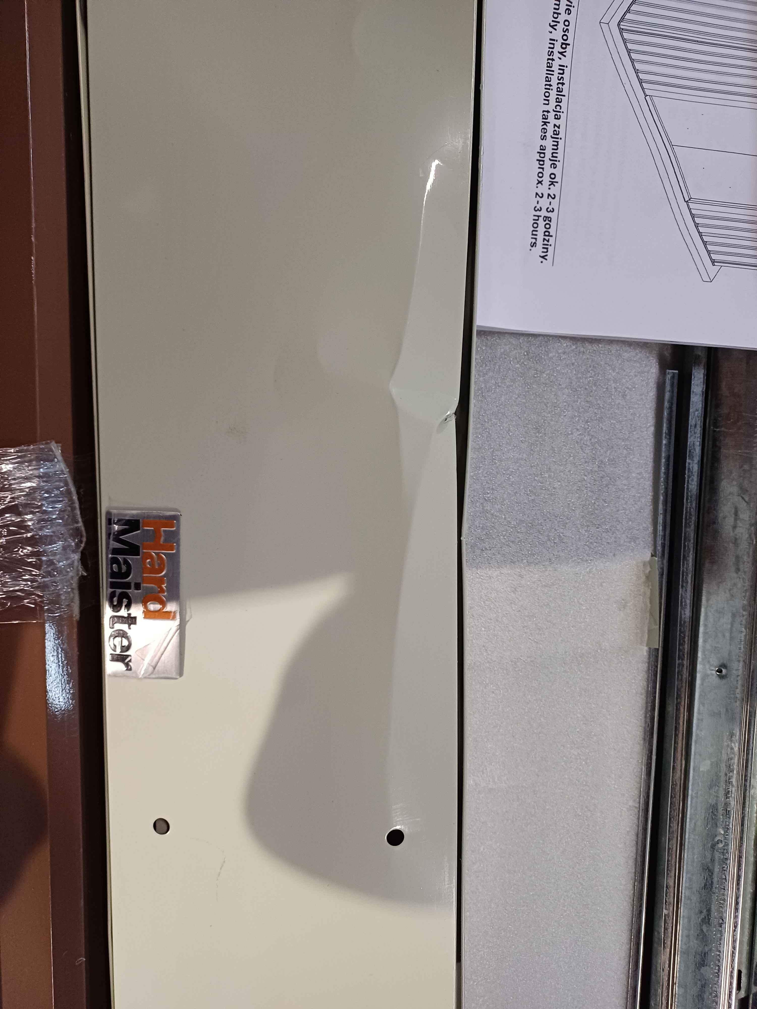blacha nad drzwiami, przy miejscu montażu kratki wentylacyjnej, z widocznym uszkodzeniem.