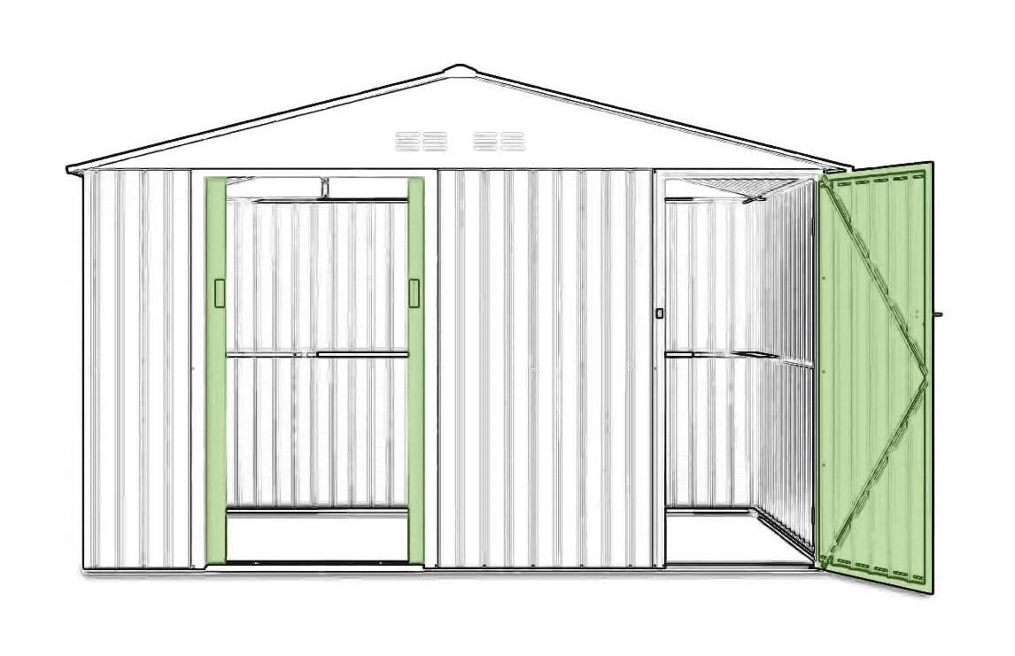 Podwójne, przesuwne drzwi w domku Falcon umożliwiają łatwe wprowadzenie większego sprzętu ogrodowego, nie zajmując miejsca przy otwieraniu. To praktyczne rozwiązanie sprawdzi się w małych ogrodach. Do mniejszego pomieszczenia prowadzą drzwi na zawiasach, zapewniające wygodny dostęp do wnętrza.
