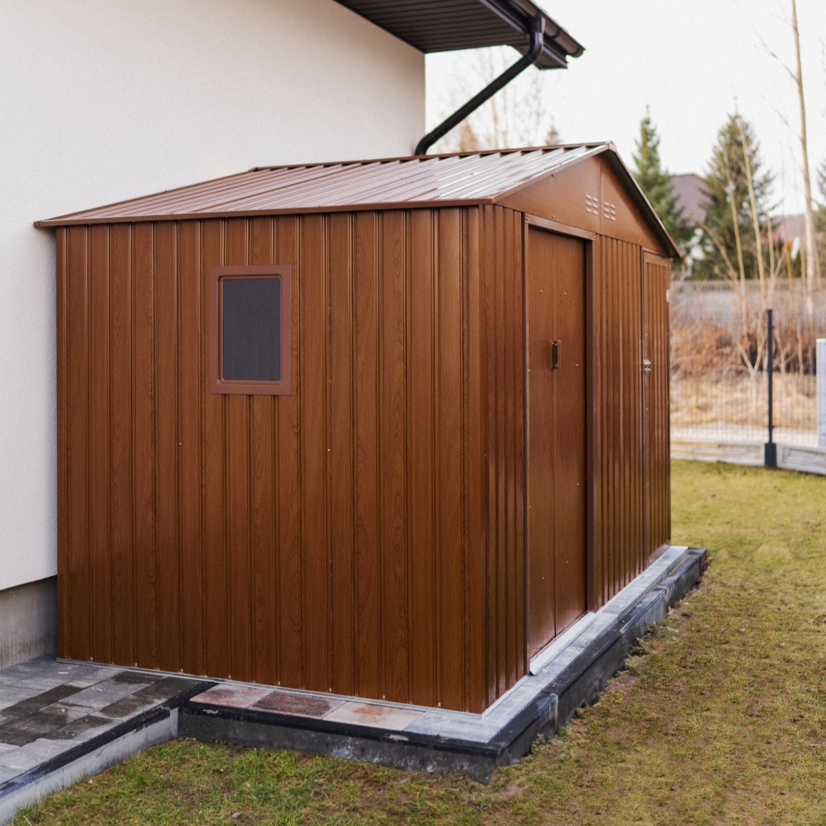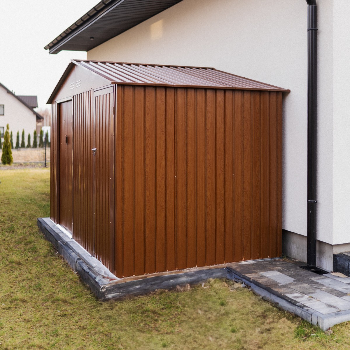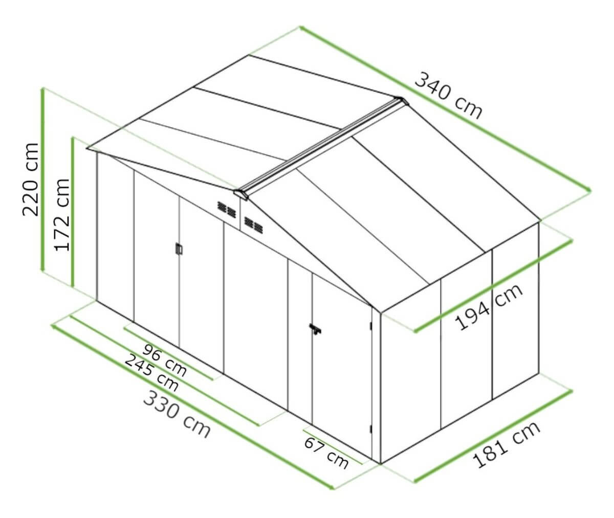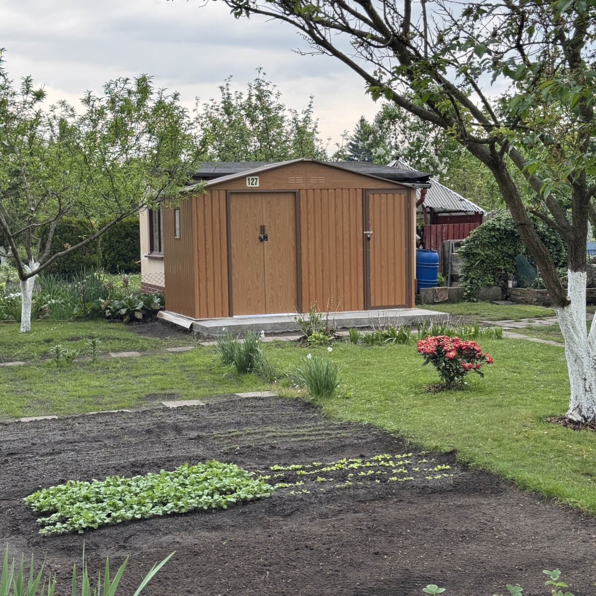 Domek narzędziowy FALCON to funkcjonalne i stylowe rozwiązanie do ogrodu, które pozwala zachować porządek i estetykę przestrzeni. Konstrukcja składa się z dwóch pomieszczeń: mniejszego (85x181 cm) na drobne narzędzia oraz większego (245x181 cm) na sprzęty takie jak kosiarka. Każde pomieszczenie ma niezależne wejście, co ułatwia organizację. Wykonany z galwanizowanej, ocynkowanej stali domek jest odporny na korozję, promieniowanie UV i wilgoć. Spadzisty dach skutecznie odprowadza wodę i śnieg, chroniąc konstrukcję przed przeciążeniem. Otwory wentylacyjne zapewniają cyrkulację powietrza, a okno z PCV oświetla wnętrze. Prosty montaż czyni go praktycznym wyborem, który łączy trwałość i estetykę.