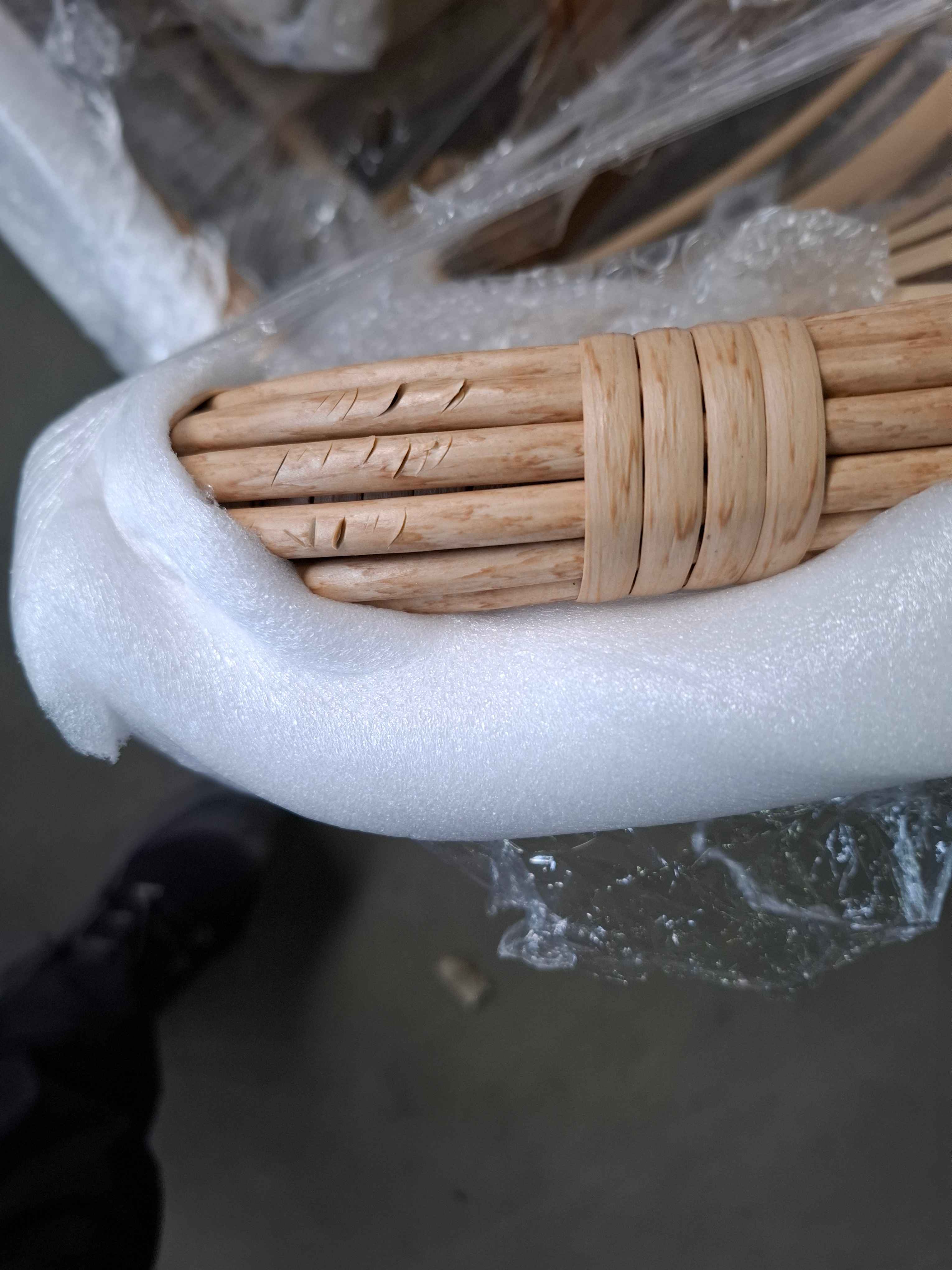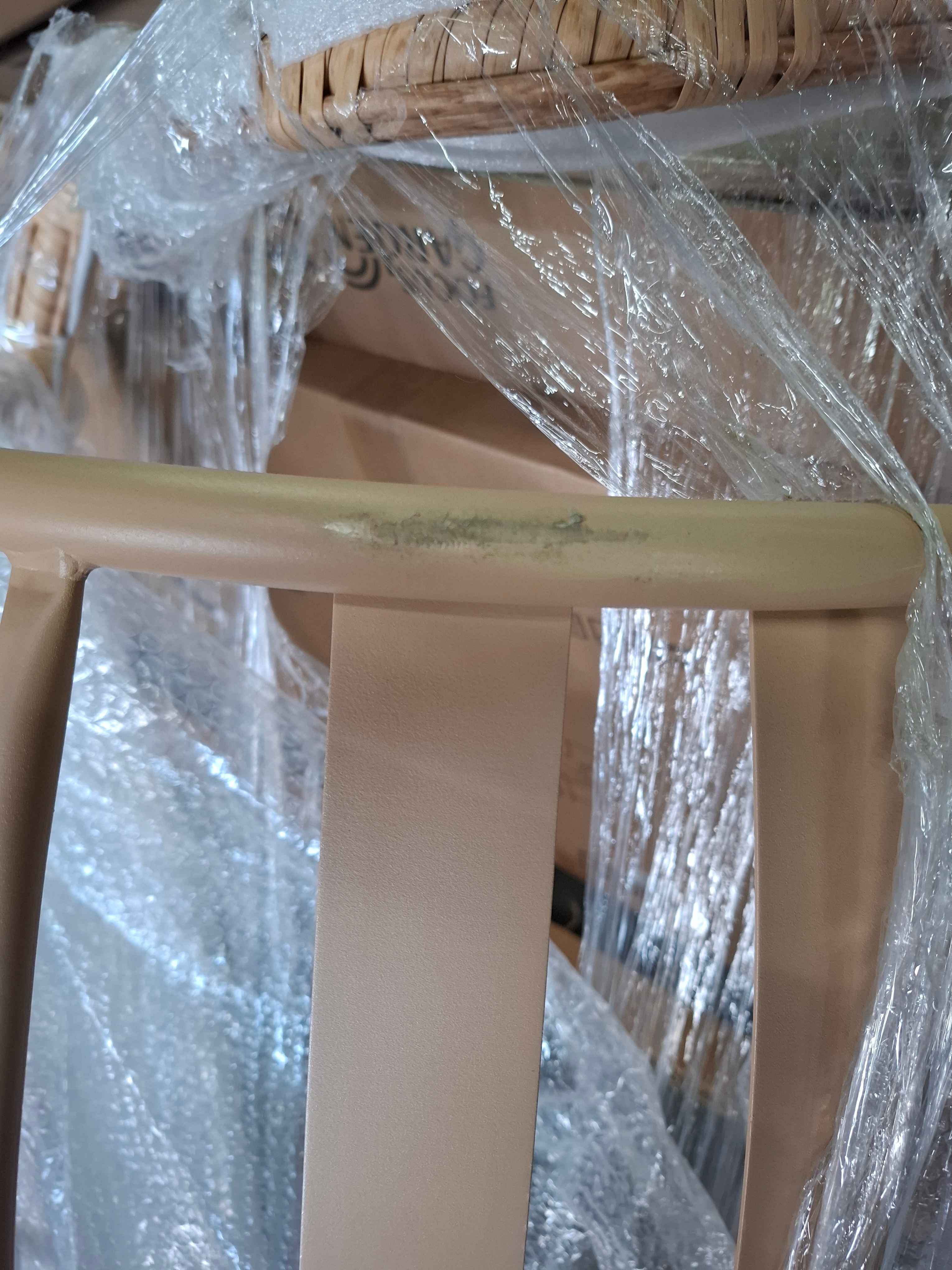 poprzecierany rattan na jednym fotelu.