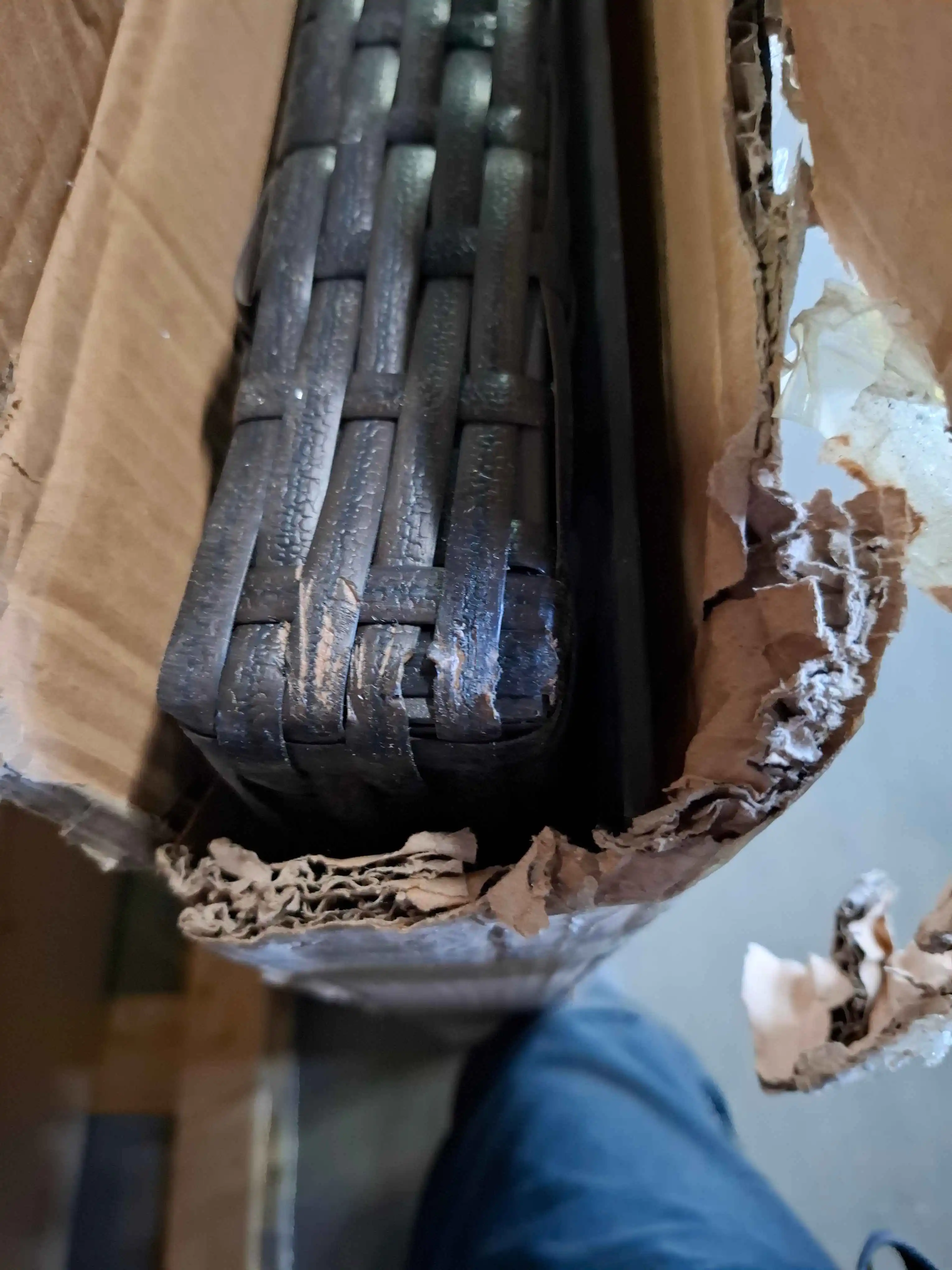 uszkodzony rattan na rogu stołu.