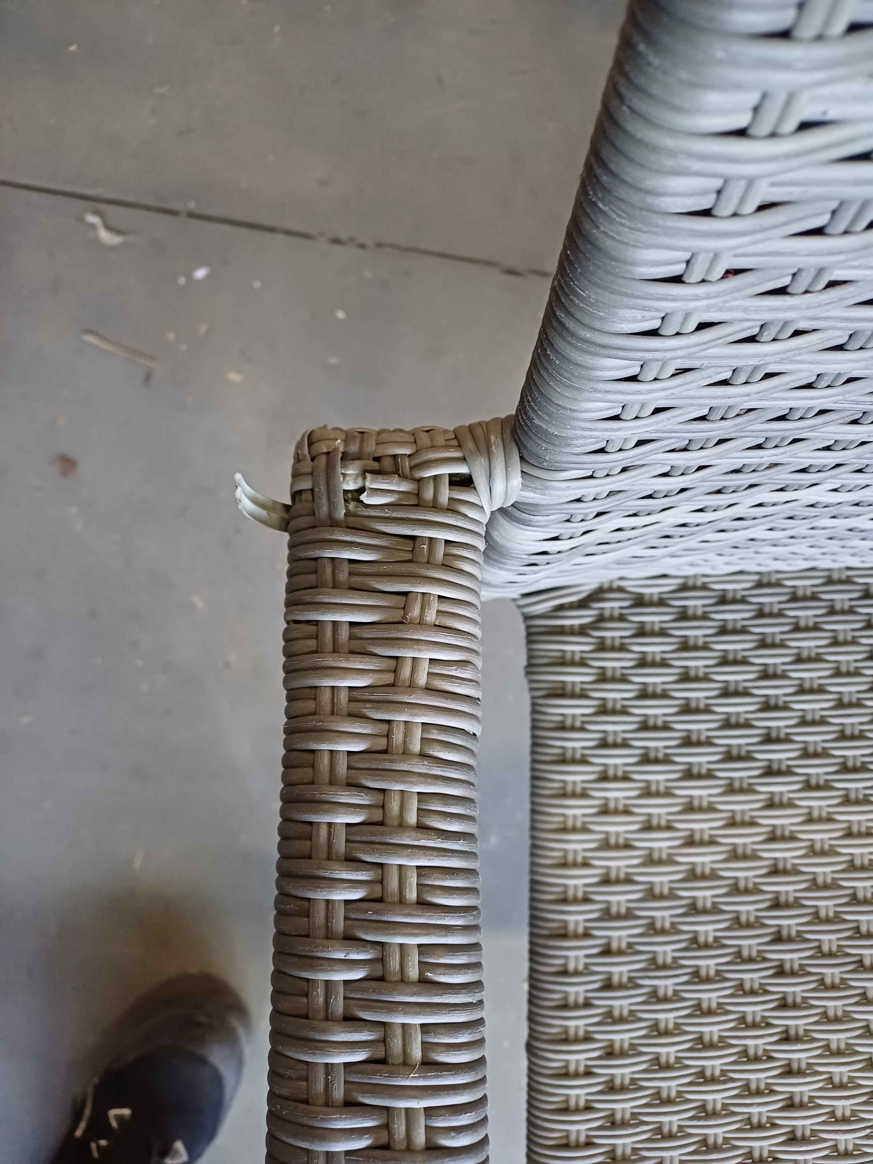 uszkodzony ratan na podłokietniku i nodze.