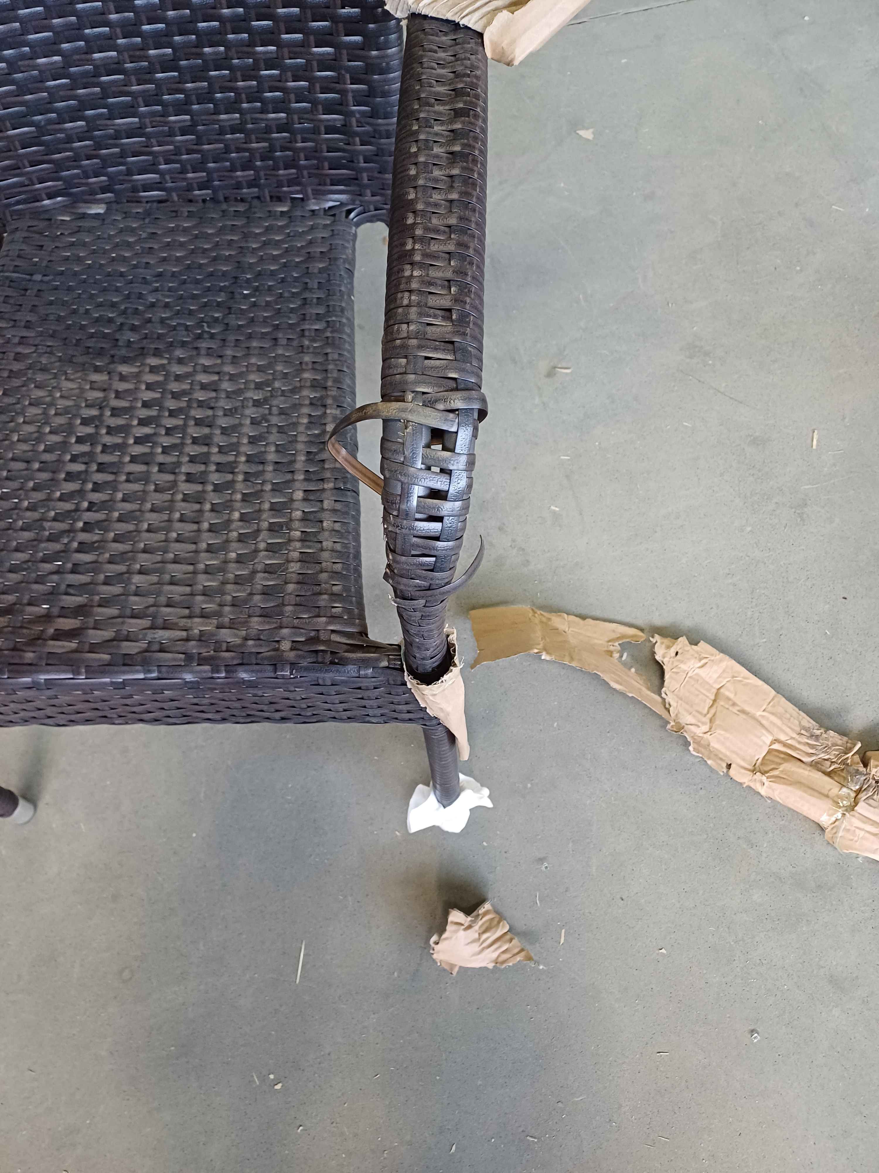 uszkodzony ratan na podłokietniku i oparciu.
