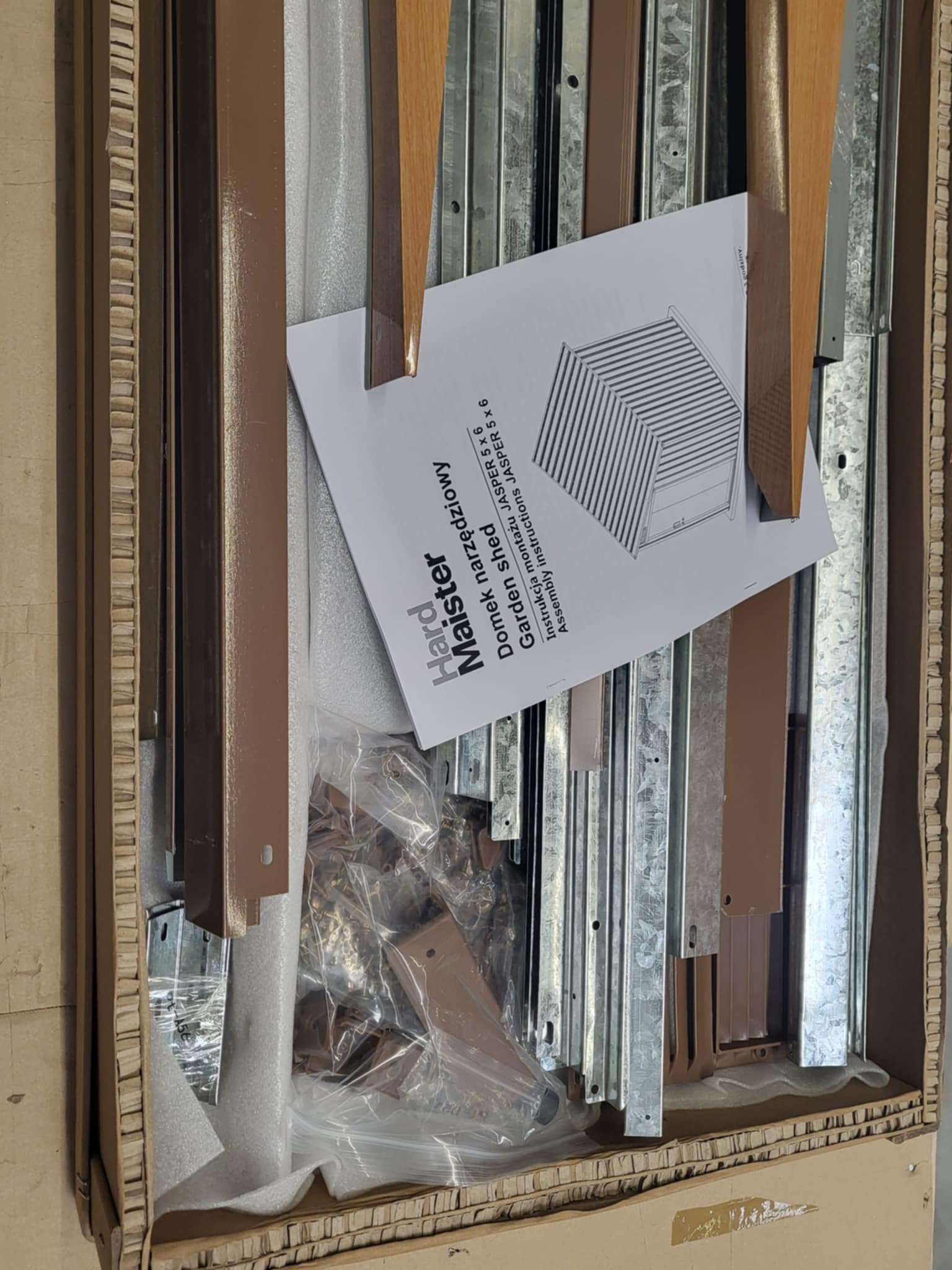 Przed rozpoczęciem montażu upewnij się, że wylewka betonowa jest odpowiednio wyrównana i całkowicie sucha. Montaż domku na nierównej powierzchni może prowadzić do niestabilności konstrukcji. W zestawie nie znajdują się kotwy montażowe do podłoża.