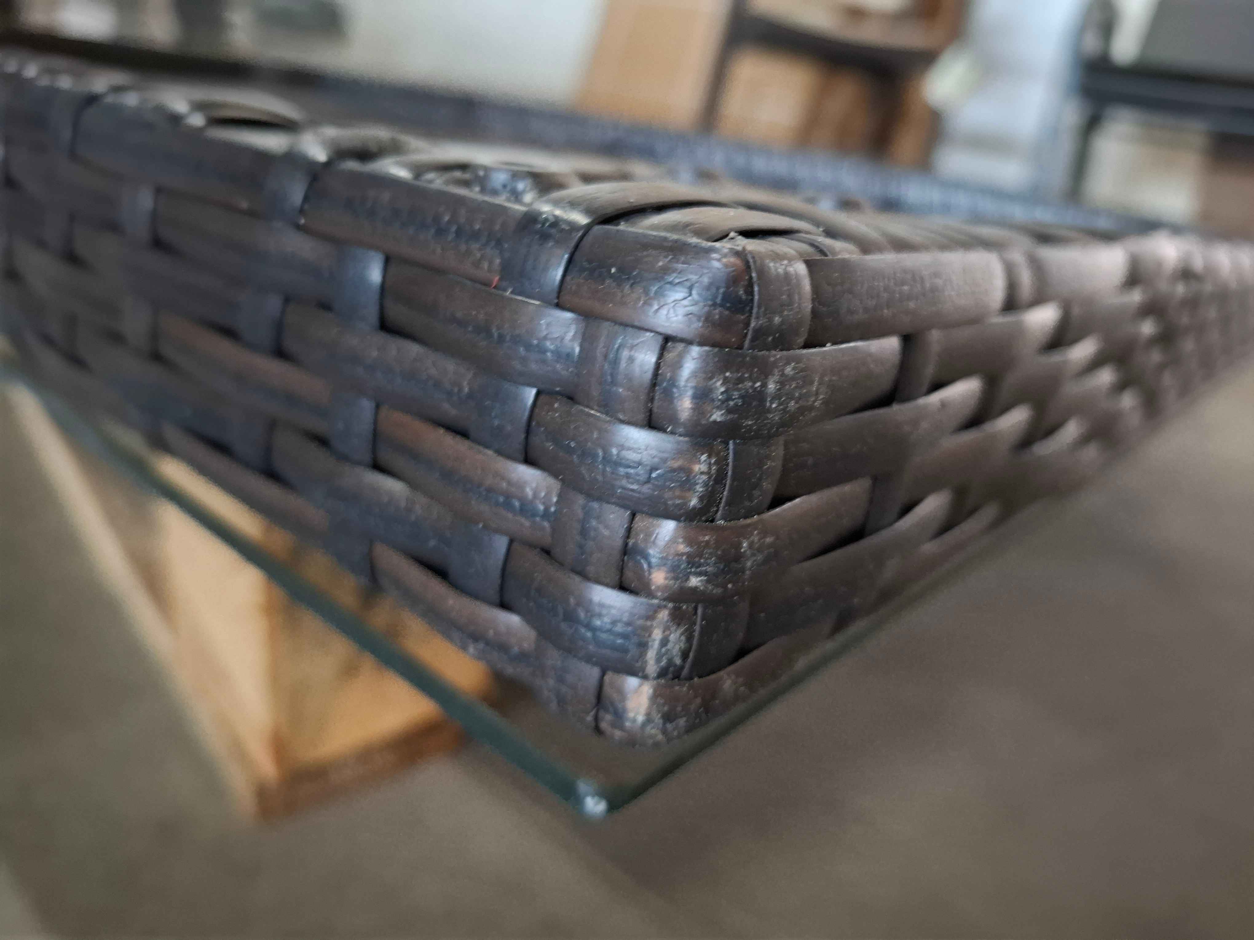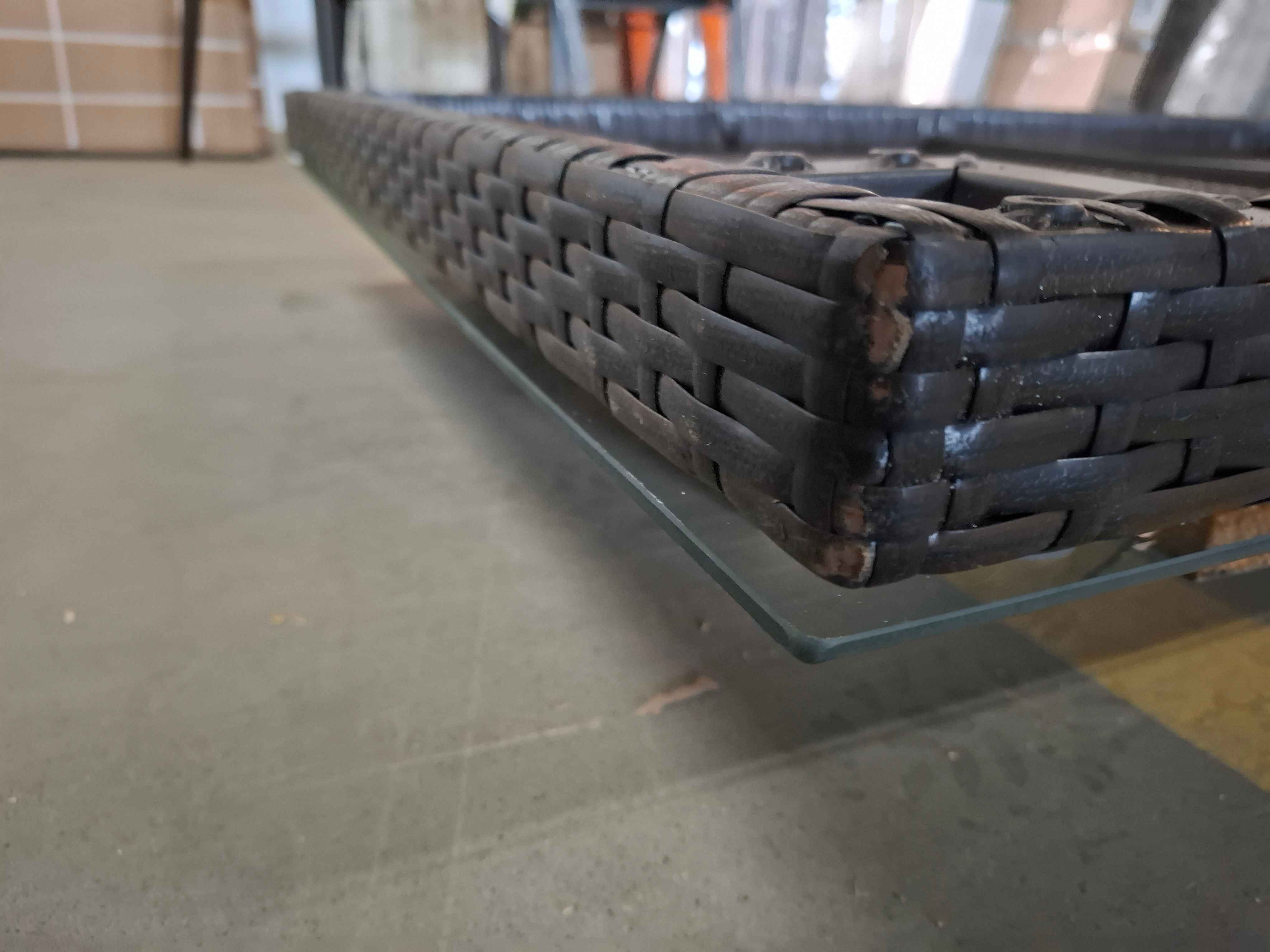 charakter stołu podkreśla ozdobny wyplot widoczny pod blatem z hartowanego szkła