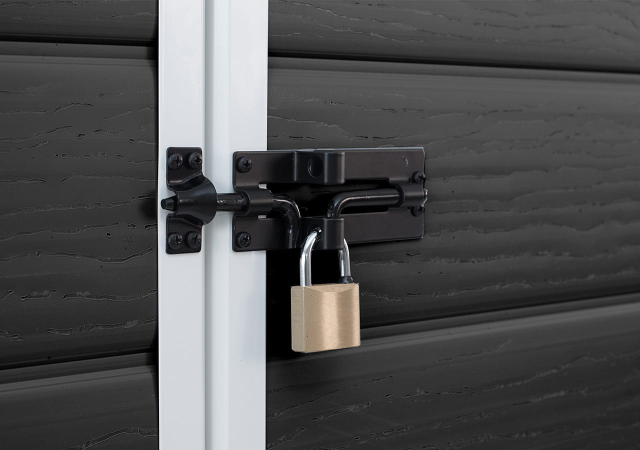 Domek wyposażony jest w zamek, który umożliwia dodatkowe zabezpieczenie zawartości. Wystarczy założyć kłódkę, aby zapewnić większą ochronę przed niepożądanym dostępem.