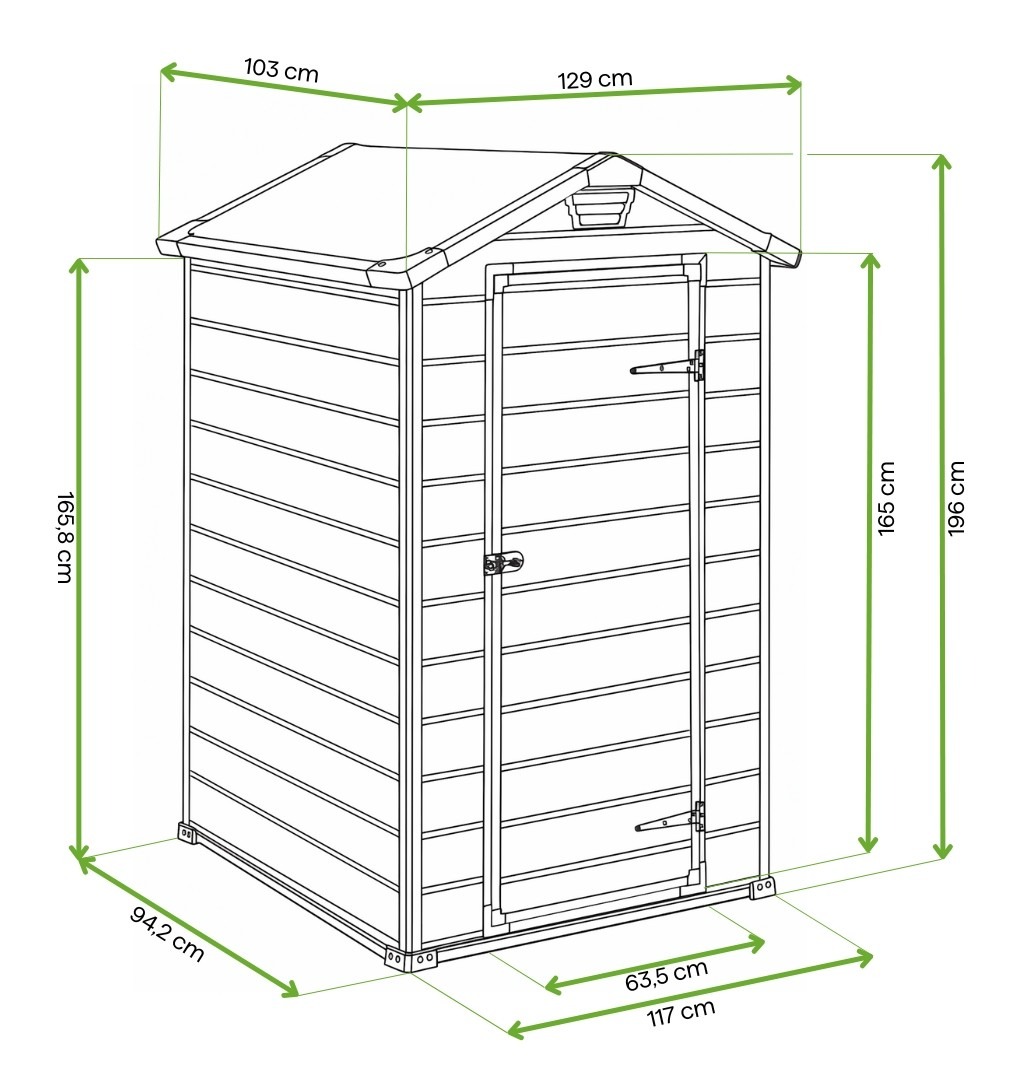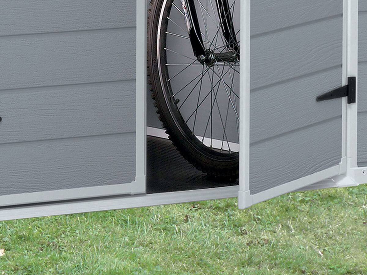 Konstrukcja z niskim progiem ułatwia wprowadzanie i wynoszenie nawet większych sprzętów. Doskonale sprawdzi się przy przechowywaniu narzędzi, rowerów czy mebli ogrodowych.
