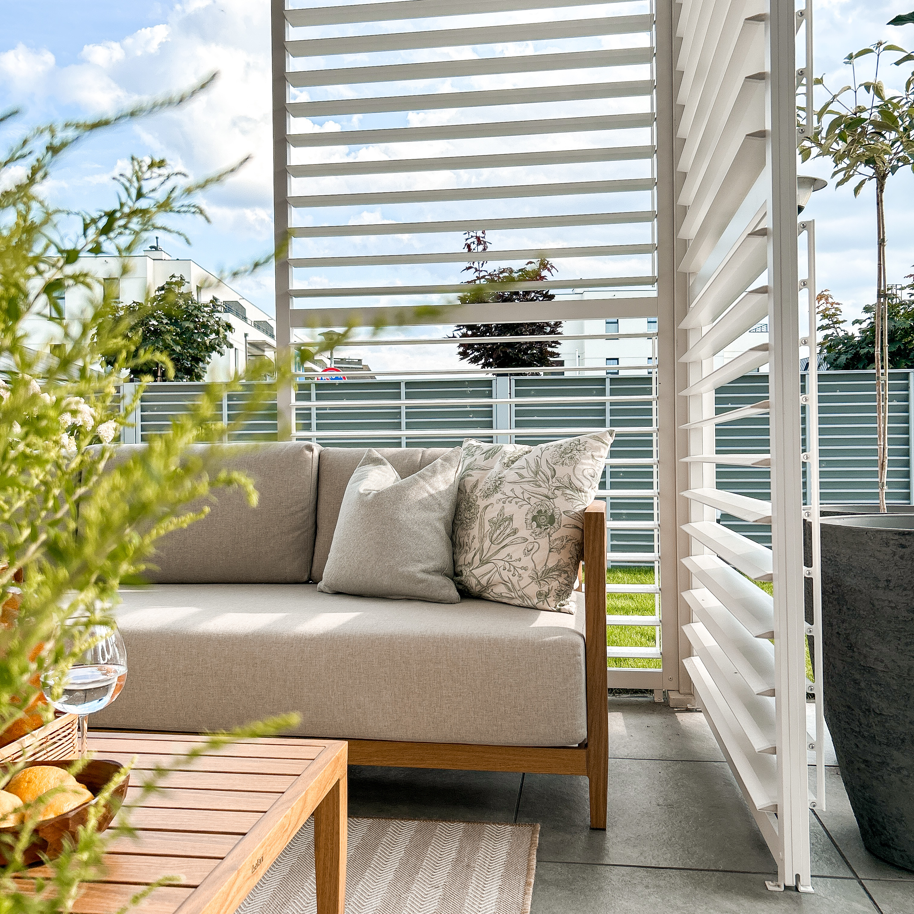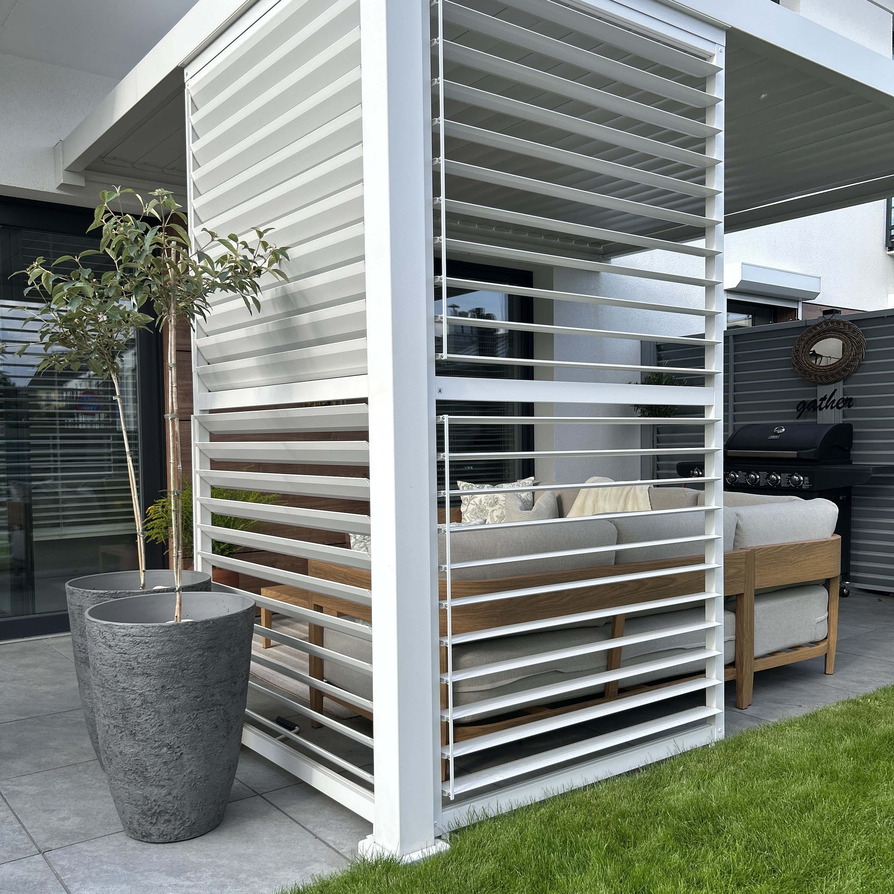 Panele sprzedawane są pojedynczo, a ich konstrukcja modułowa daje możliwość dowolnej konfiguracji. Można je montować oddzielnie lub łączyć w większe zestawy, aby stworzyć pełną zabudowę boku pergoli. Panel o szerokości 123,5 cm jest idealny do zabudowy pergoli o długości 4 m. Aby zabudować całą ścianę 3-metrowej pergoli, potrzeba trzech paneli. Dostępne są dwie opcje rozmiarowe: 93 cm do pergoli 3 m oraz 123,5 cm do pergoli 4 m.