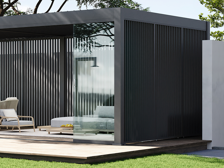 Osłona narożna – zastosuj ścianki w narożnikach pergoli, aby zyskać osłonę z dwóch stron oraz dodatkowe zabezpieczenie przed wiatrem