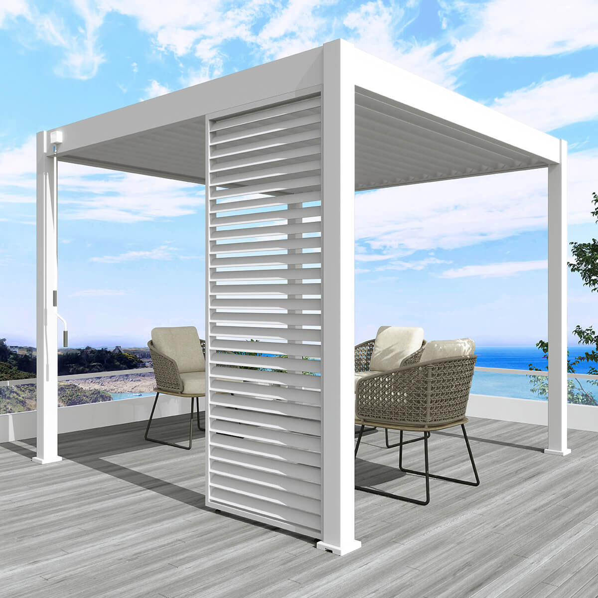 Pełna osłona – zamontuj panele wzdłuż całego boku pergoli, aby stworzyć zaciszną strefę relaksu i skutecznie ochronić się przed wiatrem oraz promieniami słonecznymi