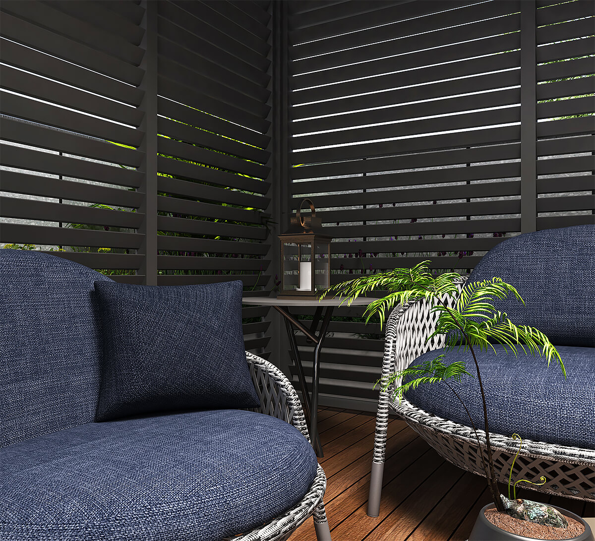 Ochrona przed słońcem i wiatrem – żaluzjowa konstrukcja tworzy barierę przed intensywnym światłem i podmuchami wiatru, jednocześnie zapewniając swobodny przepływ powietrza.