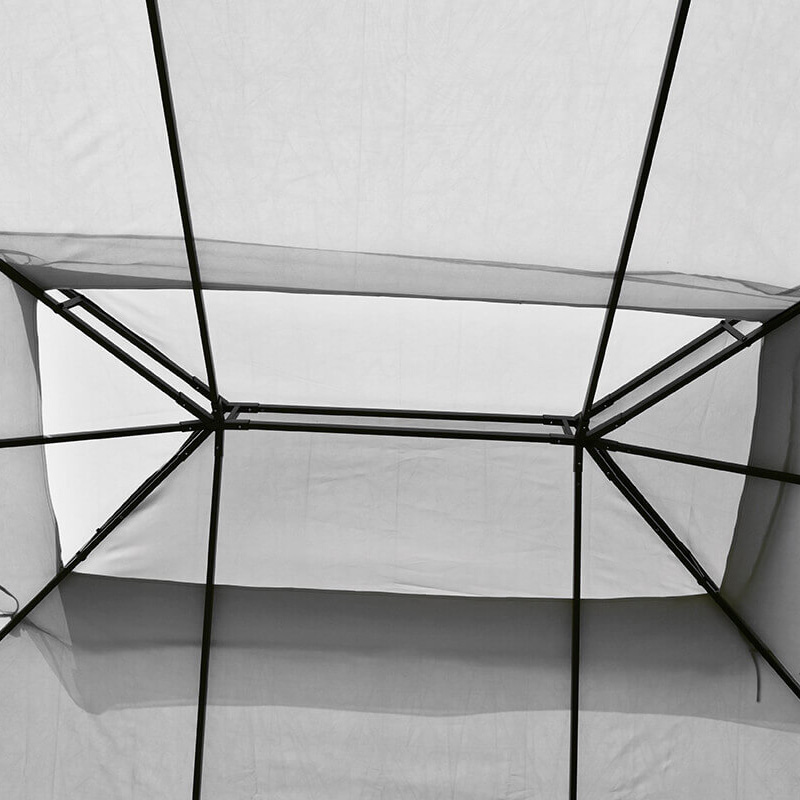 Zadaszenie wykonane z solidnej, wodoodpornej tkaniny skutecznie zabezpiecza przed lekkim deszczem oraz promieniowaniem UV. Wbudowany wywietrznik wspiera naturalną cyrkulację powietrza, dzięki czemu wnętrze pawilonu pozostaje przewiewne i świeże – nawet w upalne dni.