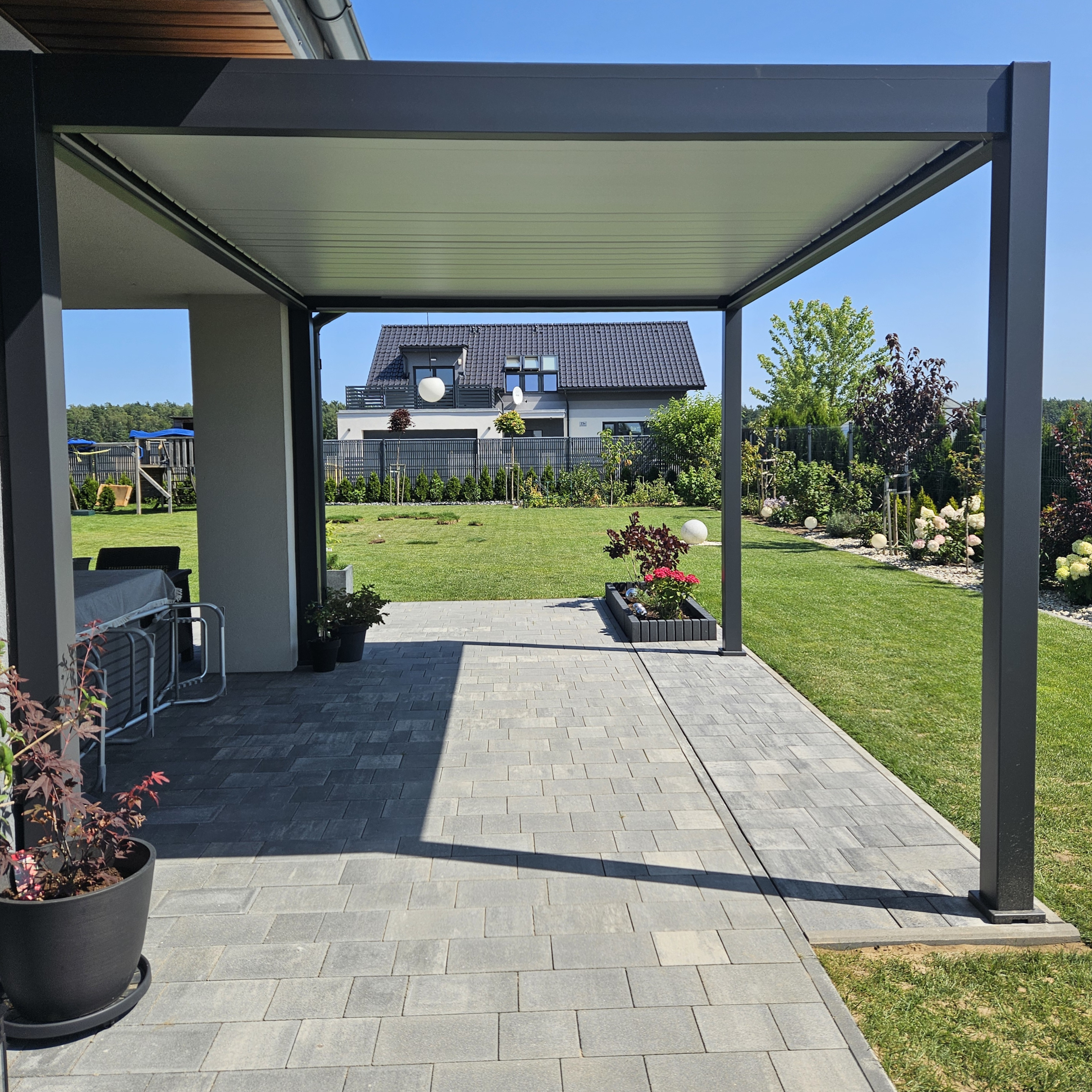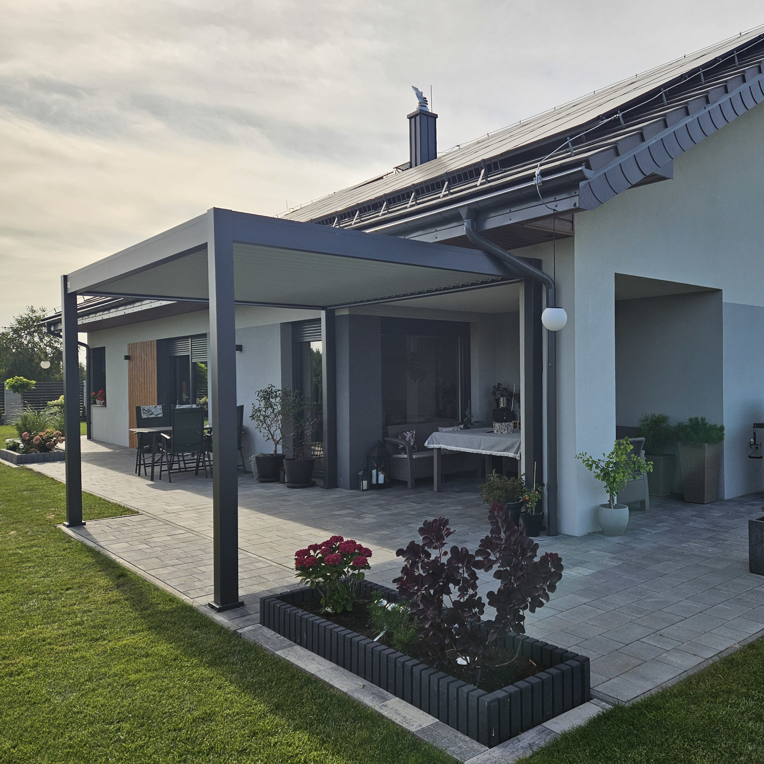 Potrzebujesz inspiracji? Oto kilka przykładowych realizacji pergoli automatycznych ELEGANCE AUTOMATIC 3x4 z oświetleniem LED Anthracite/Light Grey - Gutroof u naszych klientów. Nie czekaj! Tak może wyglądać Twój ogród!