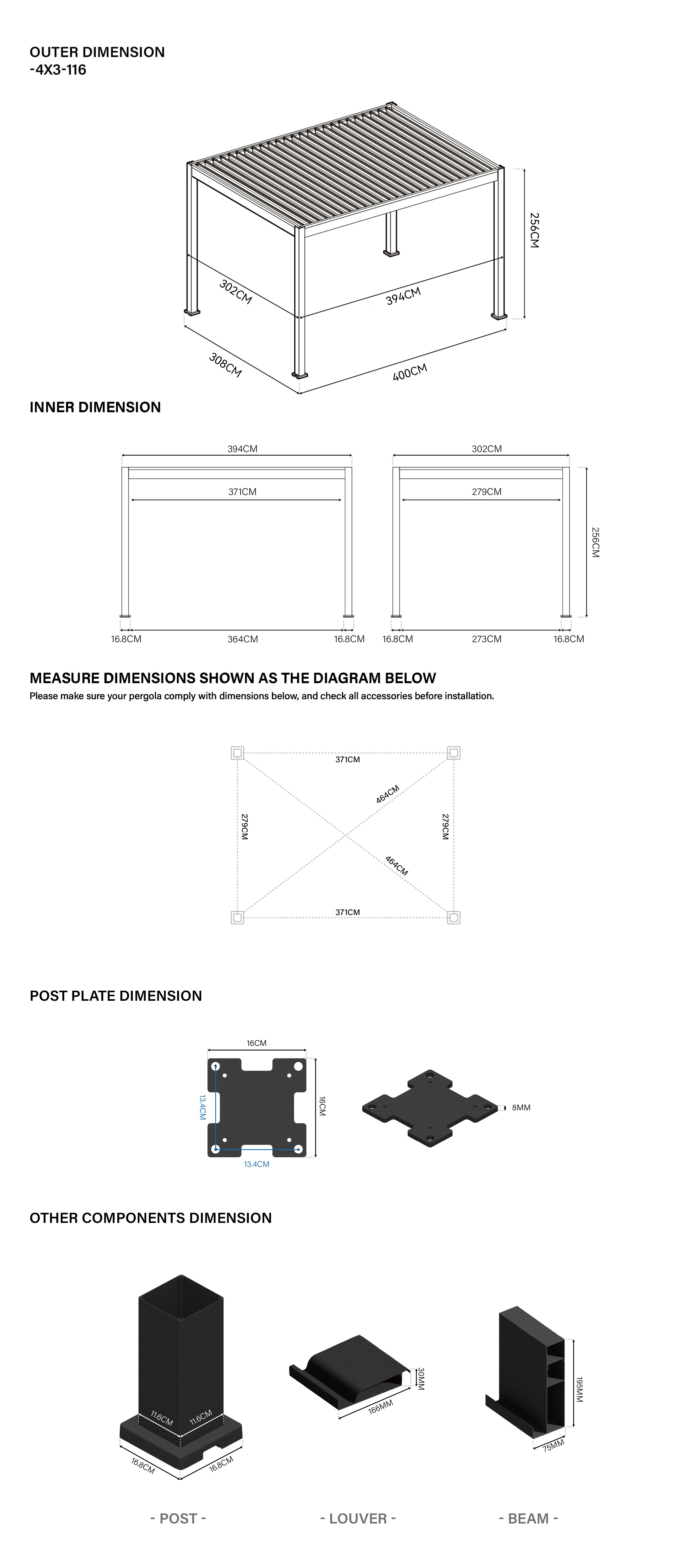 Pergola została stworzona z myślą o trwałości i niezawodności w każdych warunkach pogodowych. Jej solidna konstrukcja wytrzymuje wiatr o prędkości do 100 km/h, co gwarantuje stabilność nawet podczas silnych podmuchów. Dach pergoli zaprojektowano tak, aby wytrzymał obciążenie śniegu do 50 kg/m², co zapewnia bezpieczeństwo także w zimowych warunkach. Wykonana z aluminium malowanego proszkowo, pergola jest odporna na promieniowanie UV i korozję, co chroni ją przed blaknięciem i uszkodzeniami. Wysoka jakość produktu została potwierdzona certyfikatem Intertek, co gwarantuje trwałość i bezpieczeństwo użytkowania.