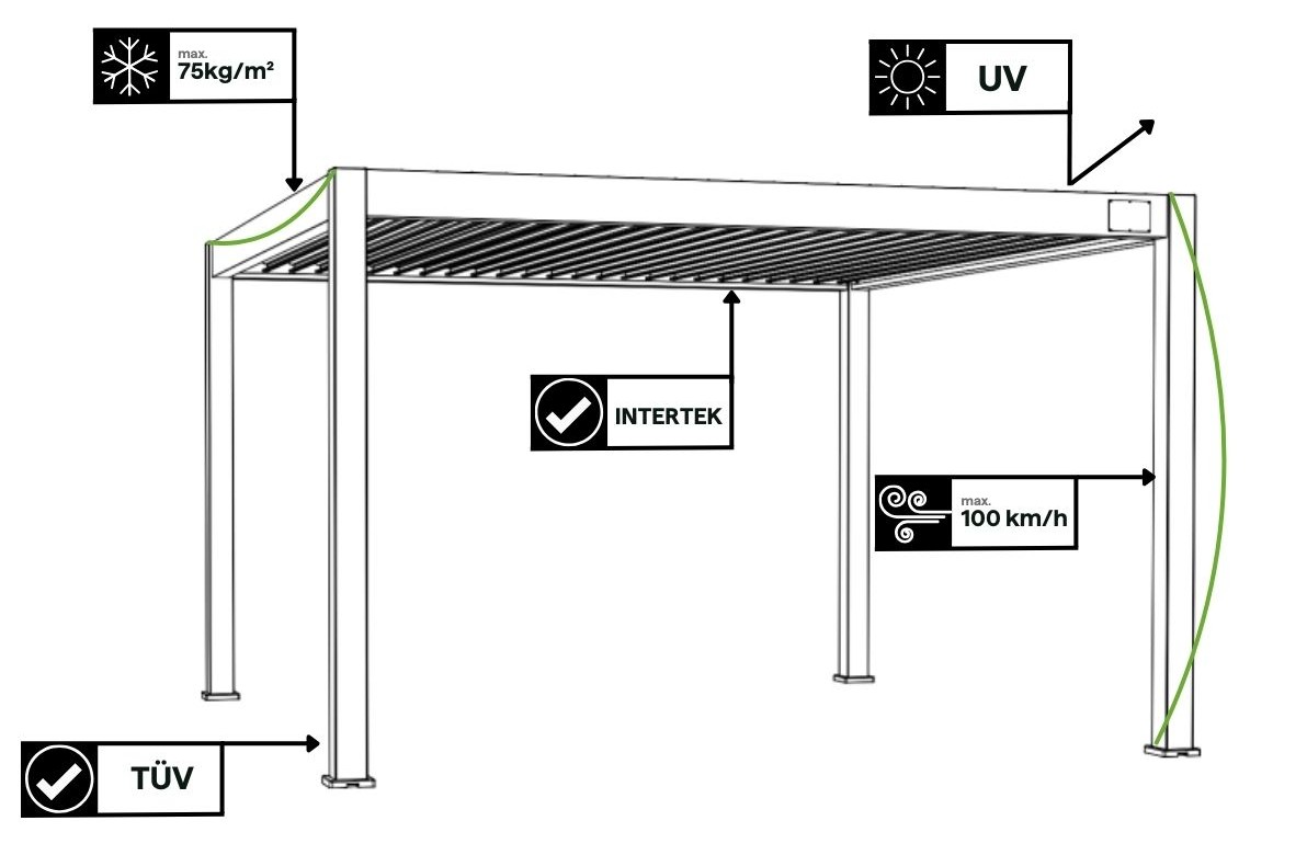 Pergola Gutroof DELUXE to synonim certyfikowanej wytrzymałości i bezpieczeństwa. Jej aluminiowa konstrukcja została zaprojektowana, by sprostać ekstremalnym warunkom: jest całkowicie odporna na korozję, UV i zmienną pogodę. Wytrzymuje wiatry do 100 km/h i obciążenie śniegiem do 75 kg/m², co potwierdzają niezależne i międzynarodowe certyfikaty TÜV oraz Intertek.
