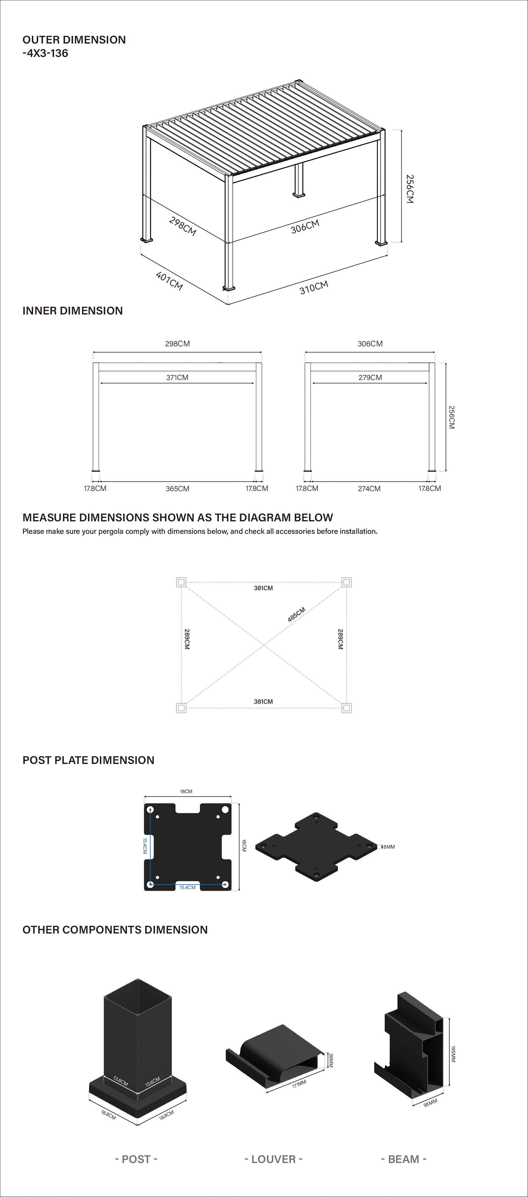 Montaż pergoli jest łatwy i nie wymaga specjalistycznych umiejętności, choć ze względu na rozmiar konstrukcji warto przeprowadzać go z pomocą 2-3 osób. Wszystkie niezbędne elementy montażowe są dołączone do zestawu, co ułatwia instalację.