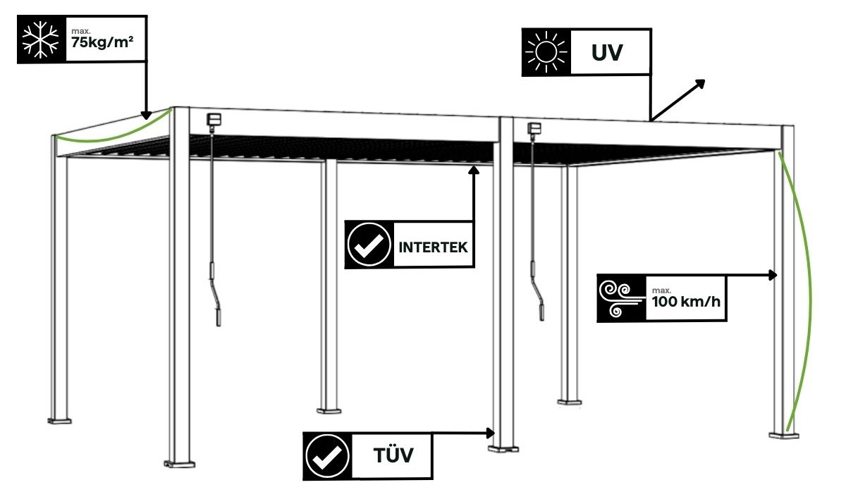 Pergola Gutroof DELUXE została zaprojektowana z myślą o trwałości i bezpieczeństwie – aluminiowa konstrukcja jest odporna na korozję, promieniowanie UV oraz zmienne warunki atmosferyczne. Wytrzymuje podmuchy wiatru do 100 km/h oraz obciążenie śniegiem do 75 kg/m². Jakość i wytrzymałość potwierdzają certyfikaty Intertek i TÜV.